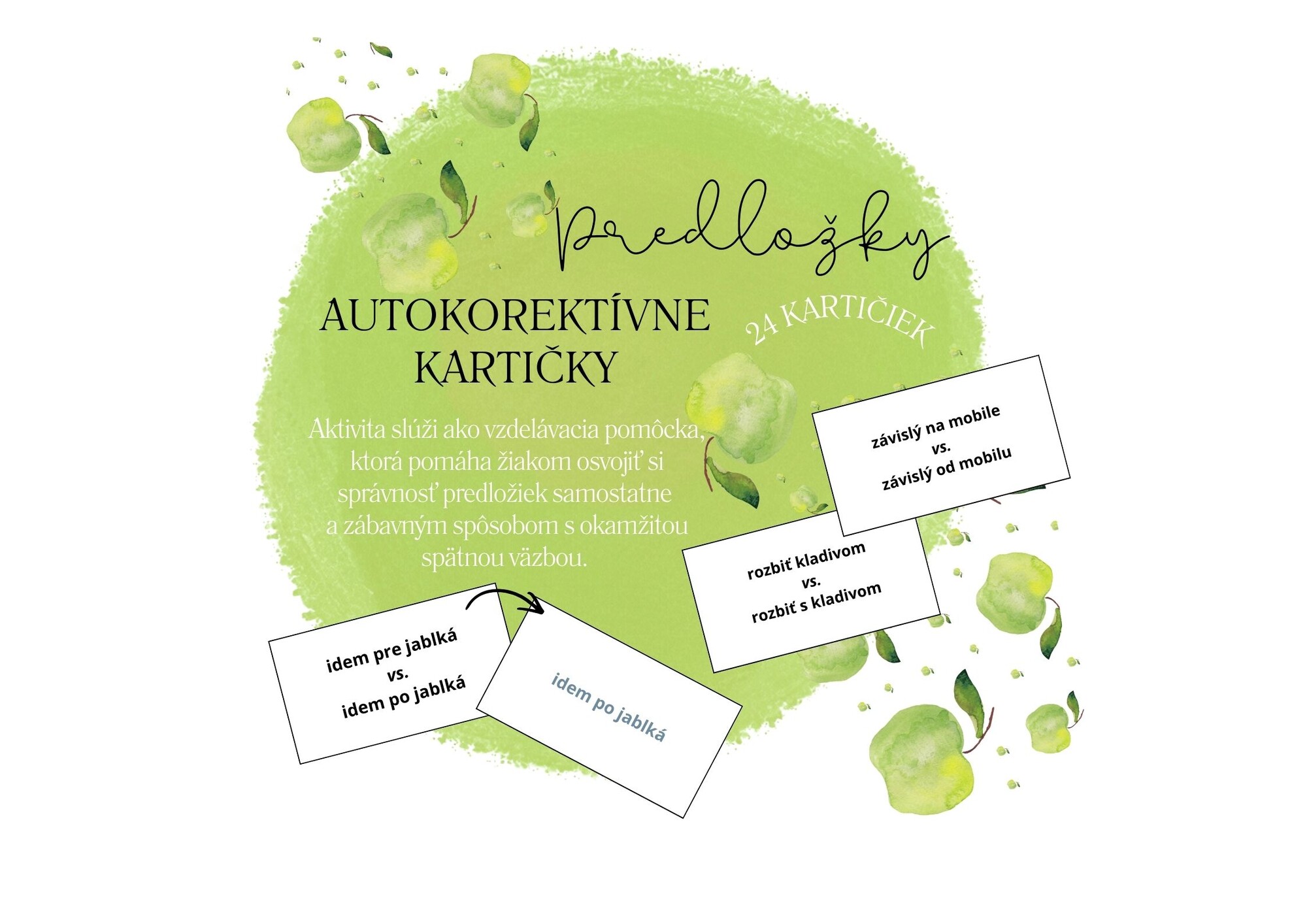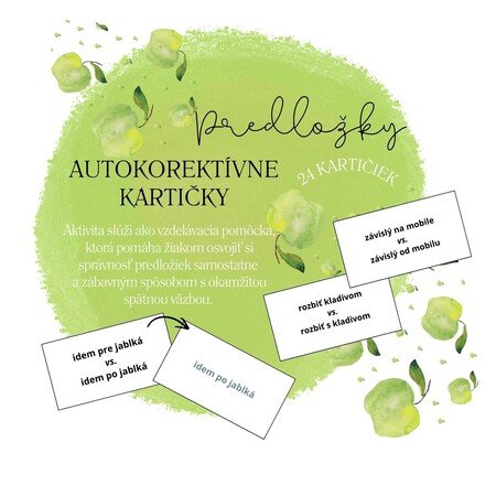 Súbor obsahuje 24 obojstranných autokorektívnych kartičiek, ktoré vytlačíte, zalaminujete a rozdáte žiakom otočené s možnosťou výberu smerom nahor. Žiaci do zošita prepíšu slovné spojenie so správnou predložkou, následne si kartičku otočia a overia si správnosť svojej odpovede.