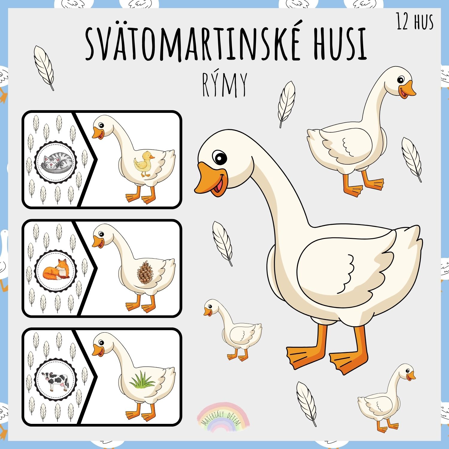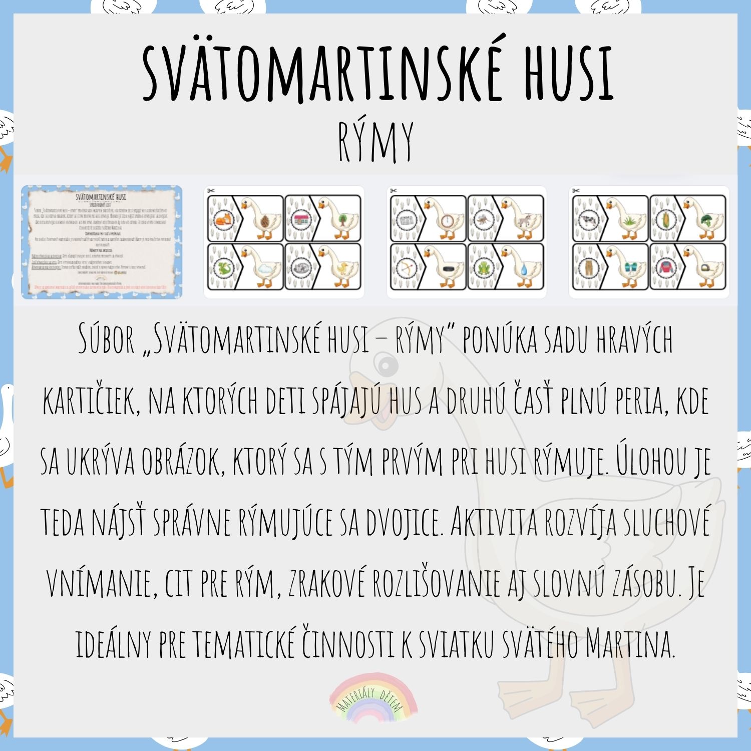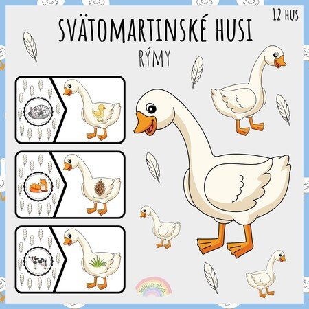 Súbor „Svätomartinské husi – rýmy“ ponúka sadu hravých kartičiek, na ktorých deti spájajú hus a druhú časť plnú peria, kde sa ukrýva obrázok, ktorý sa s tým prvým pri husi rýmuje. Úlohou je teda nájsť správne rýmujúce sa dvojice. Aktivita rozvíja sluchové vnímanie, cit pre rým, zrakové rozlišovanie aj slovnú zásobu. Je ideálny pre tematické činnosti k sviatku svätého Martina.