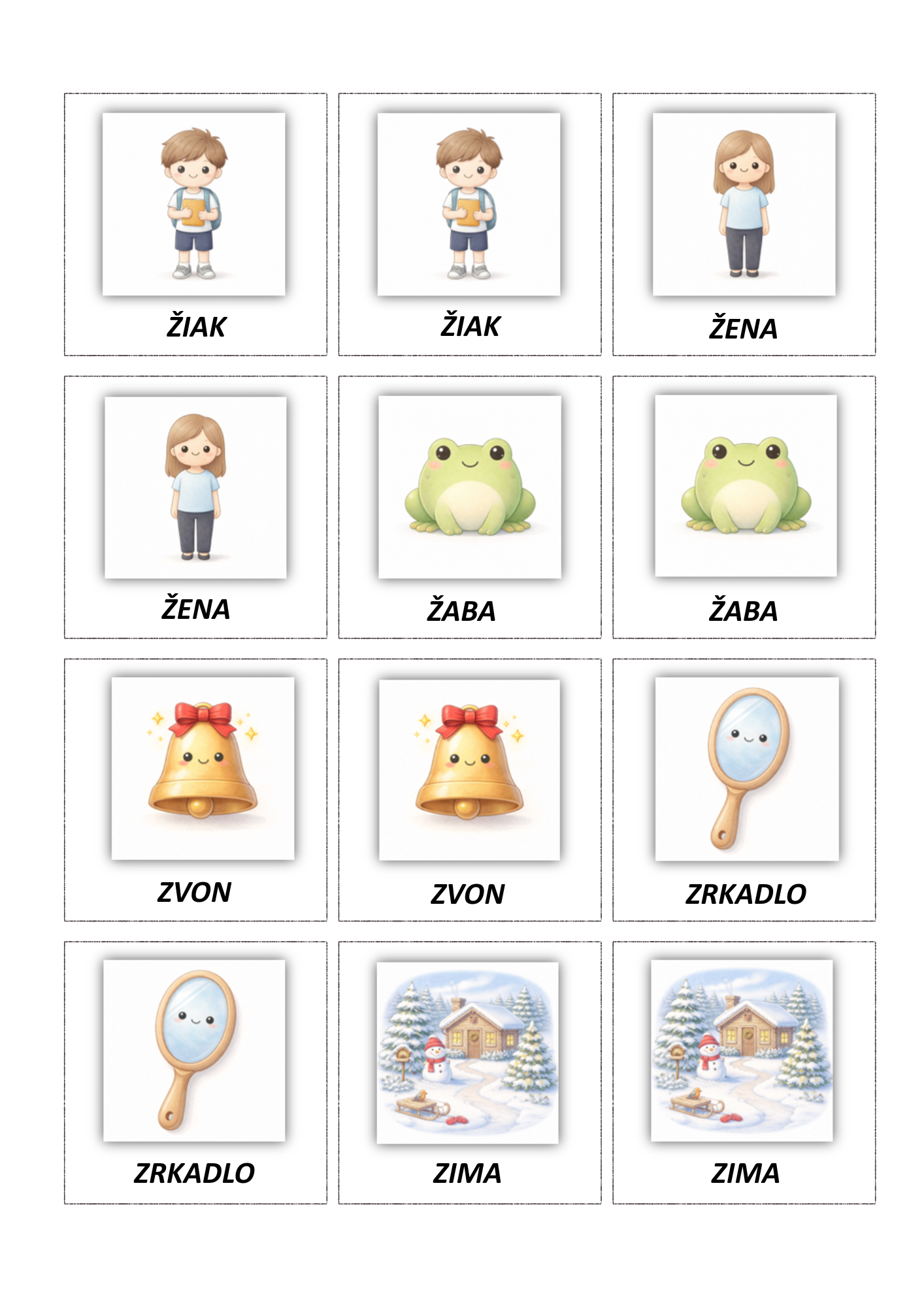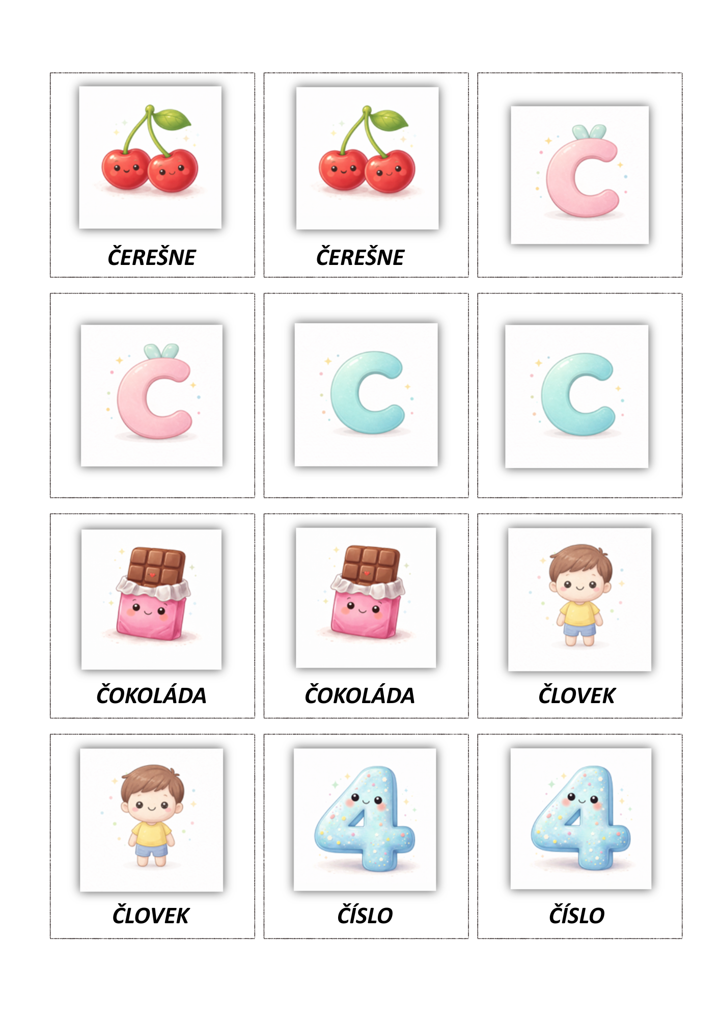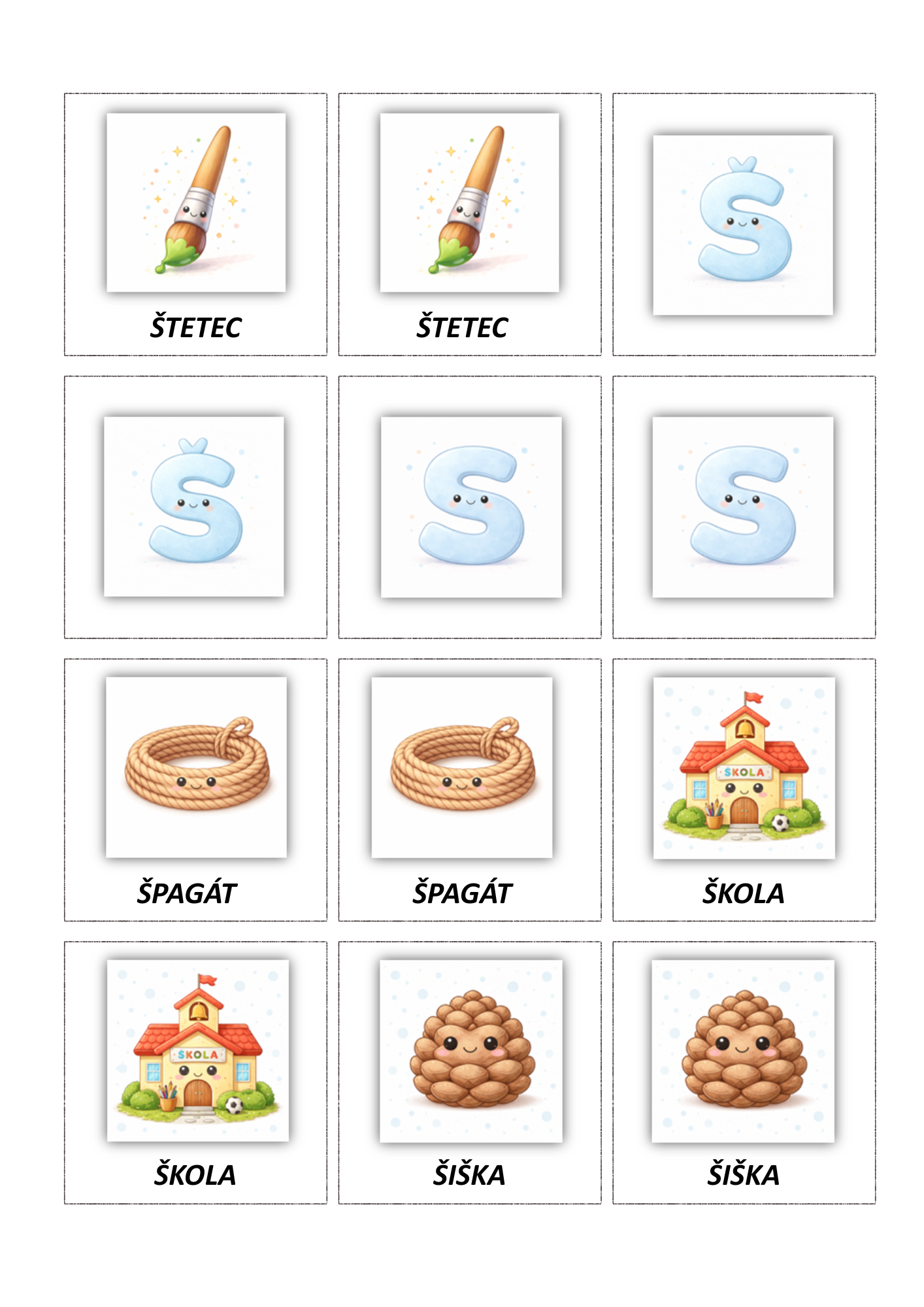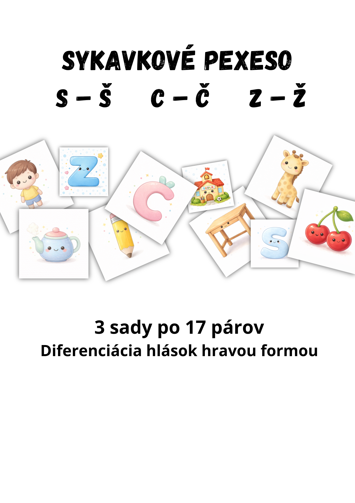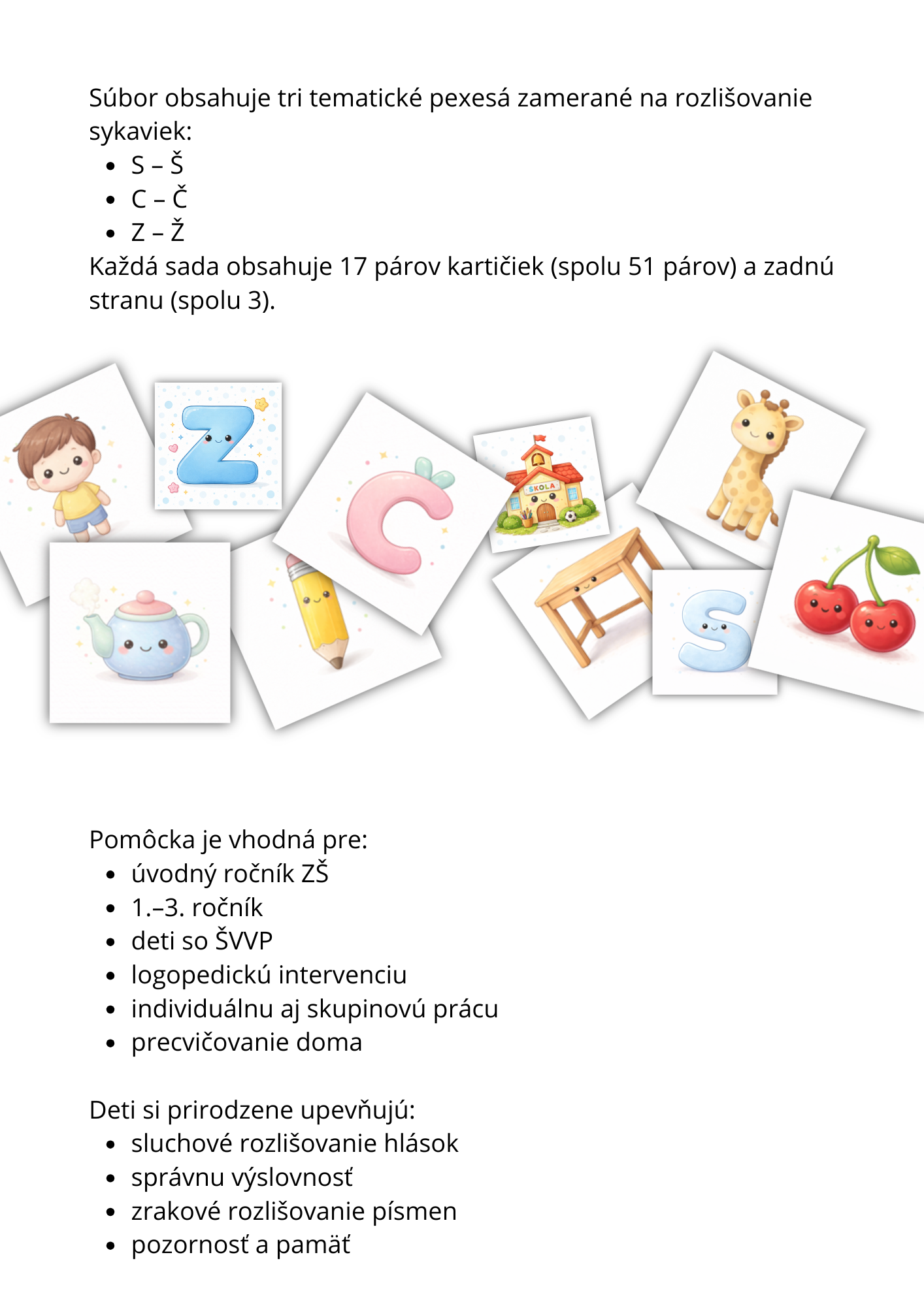Súbor obsahuje 3 sady hláskových kartičiek, každá sada má 17 párov obrázkov a jednu zadnú stranu (spolu 51 párov / 102 kartičiek a 3 zadné strany). Materiál je vhodný na rozvoj fonematického uvedomovania, sluchového rozlišovania sykaviek, správnej výslovnosti a zrakovej pamäti.
