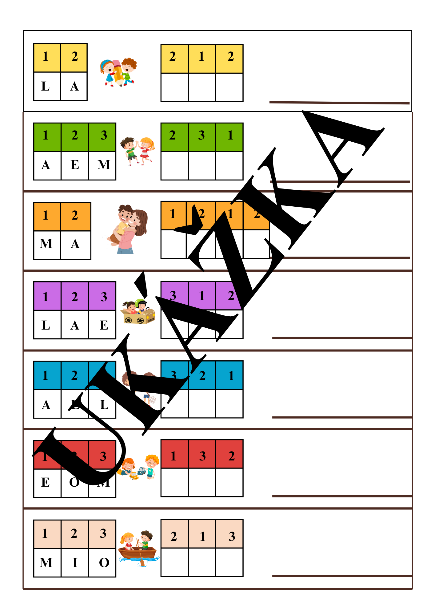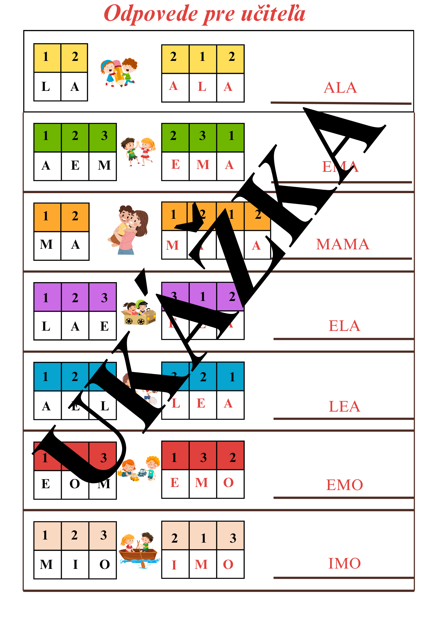 Každý obdĺžnik obsahuje dve tabuľky: legendu, podľa ktorej žiaci dopĺňajú písmenká do vedľajšej tabuľky. Riadok vedľa slúži na zapísanie vylúšteného slova.