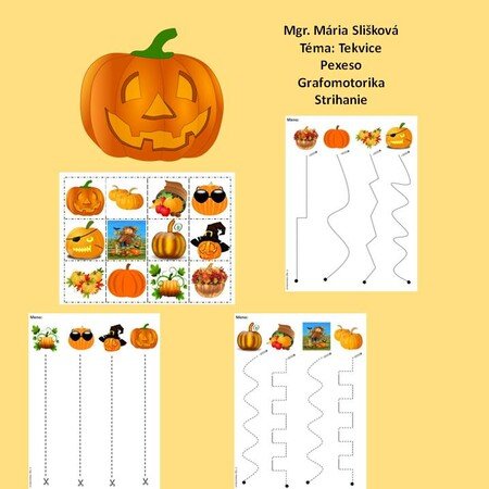 Pdf materiál na tému tekvičky, ktorý obsahuje pexeso s 12 obrázkami, pracovný list na strihanie a dva na obťahovanie.
