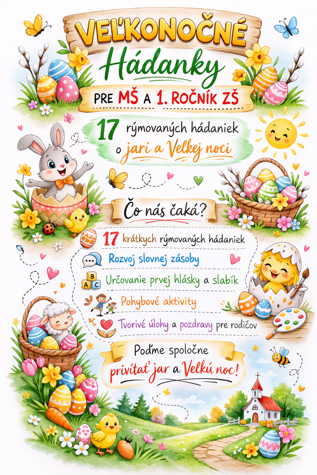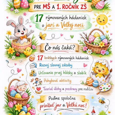 Edukačný PDF materiál obsahuje 17 rýmovaných veľkonočných hádaniek spracovaných vo forme tematických kartičiek. Súbor je vhodný pre deti v materskej škole a žiakov 1. ročníka ZŠ.