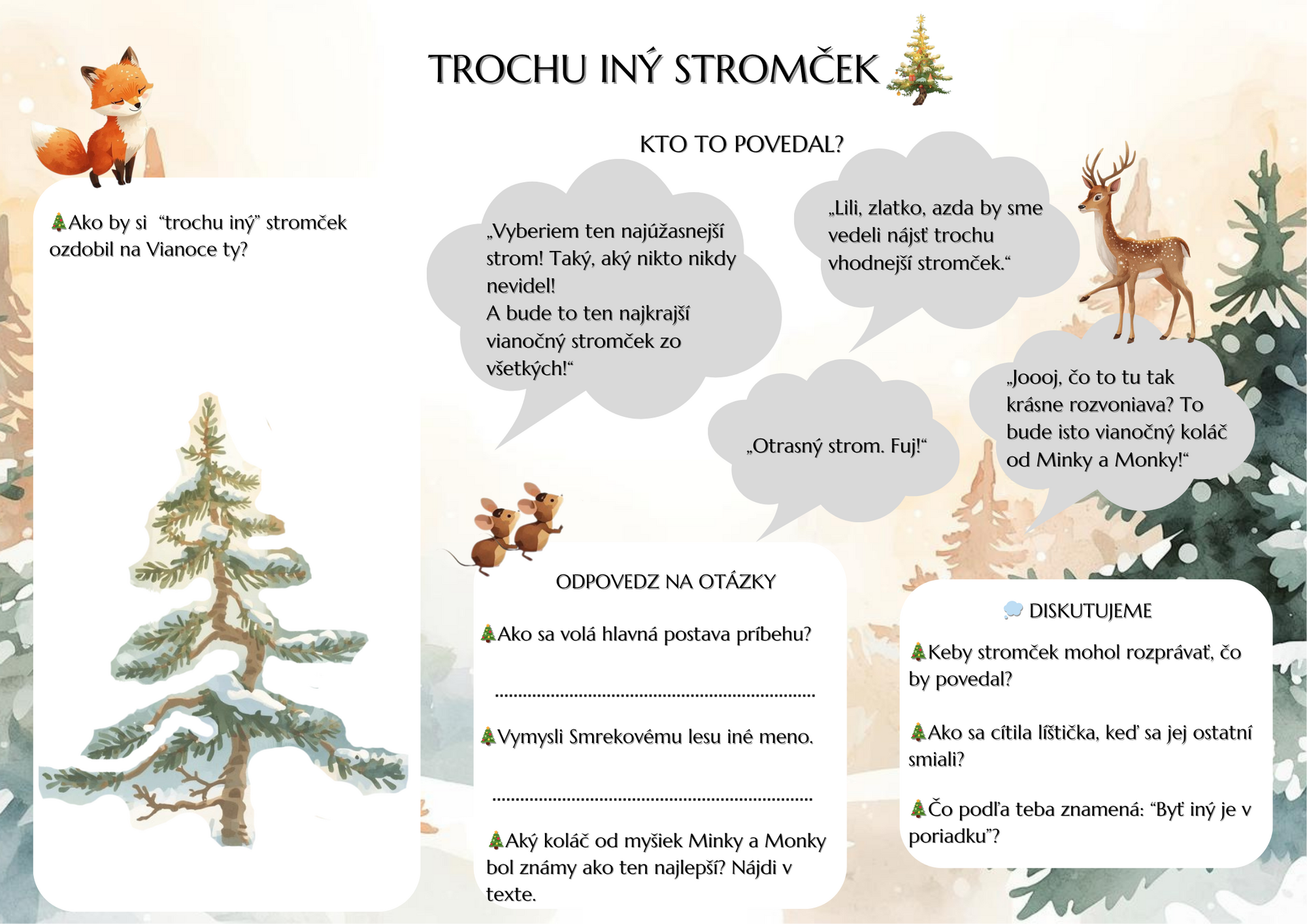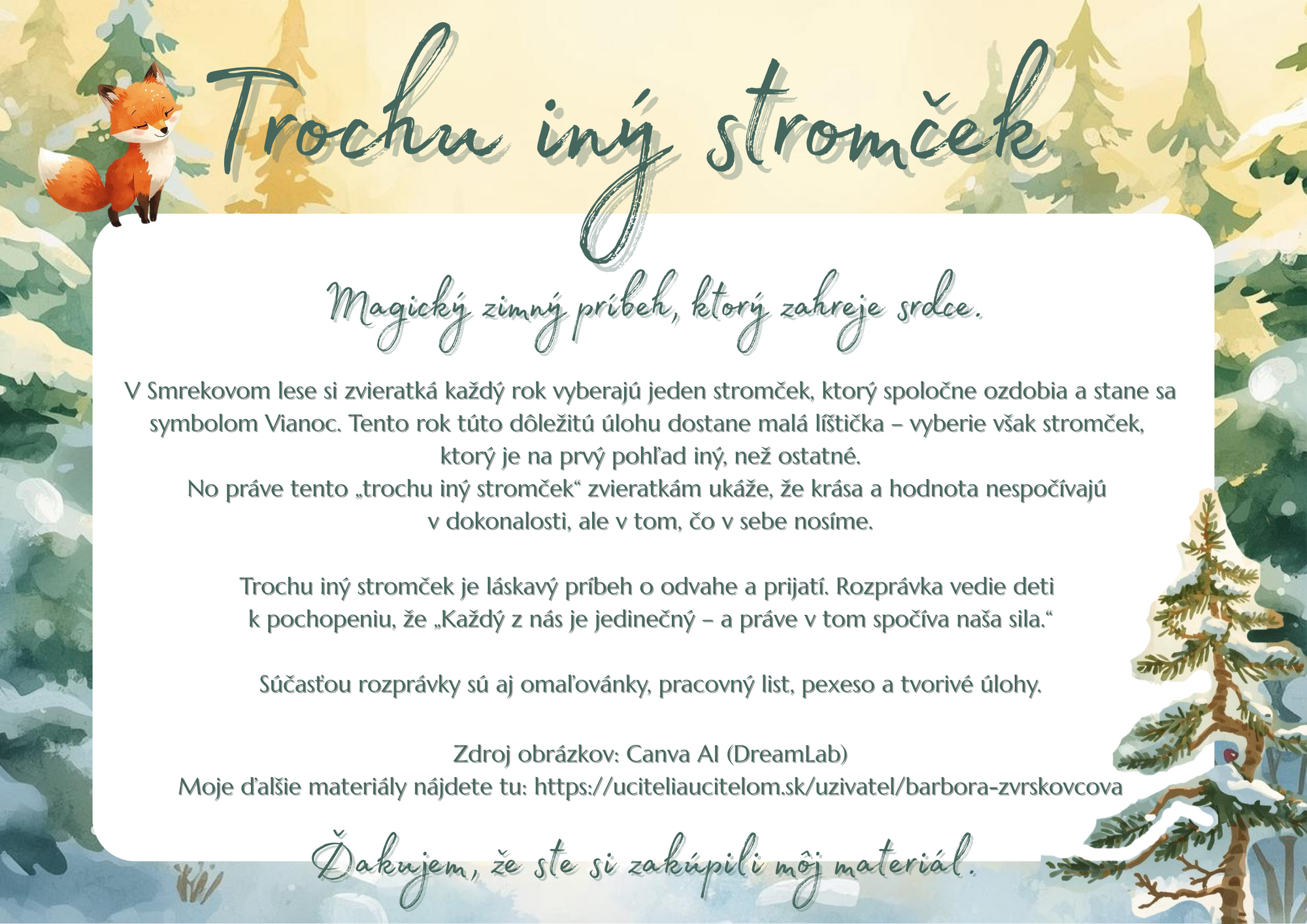 V Smrekovom lese si zvieratká každý rok vyberajú jeden stromček, ktorý spoločne ozdobia a stane sa symbolom Vianoc. Tento rok túto dôležitú úlohu dostane malá líštička – vyberie však stromček, ktorý je na prvý pohľad iný, než ostatné. No práve tento „trochu iný stromček“ zvieratkám ukáže, že krása a hodnota nespočívajú v dokonalosti, ale v tom, čo v sebe nosíme.