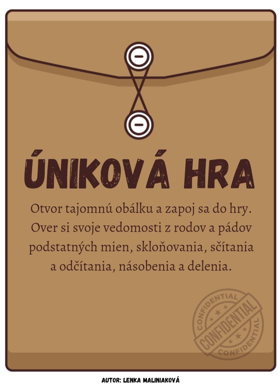Dobrý deň, ponúkam únikovú hru pre 4. ročník. Hra obsahuje pracovné listy, pomôcky, metodický postup hry a správne riešenia. Úlohou žiakov je vyriešiť úlohy v stanovištiach a odhaliť tajomstvo, vďaka, ktorému uniknú z hry.