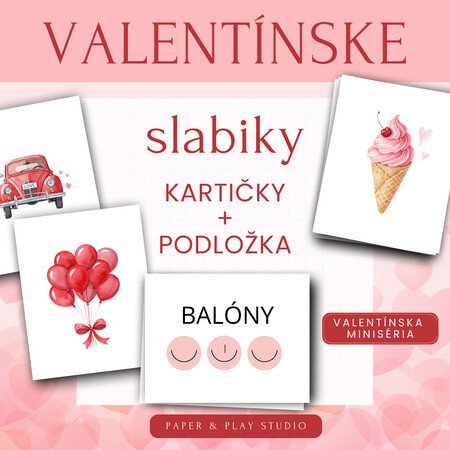 Valentínske slabiky sú didaktický manipulačný materiál určený pre deti v materskej škole. Prostredníctvom obrázkových kartičiek a podložky si deti rozvíjajú fonematické uvedomovanie a pracujú so slabikami hravou a názornou formou.