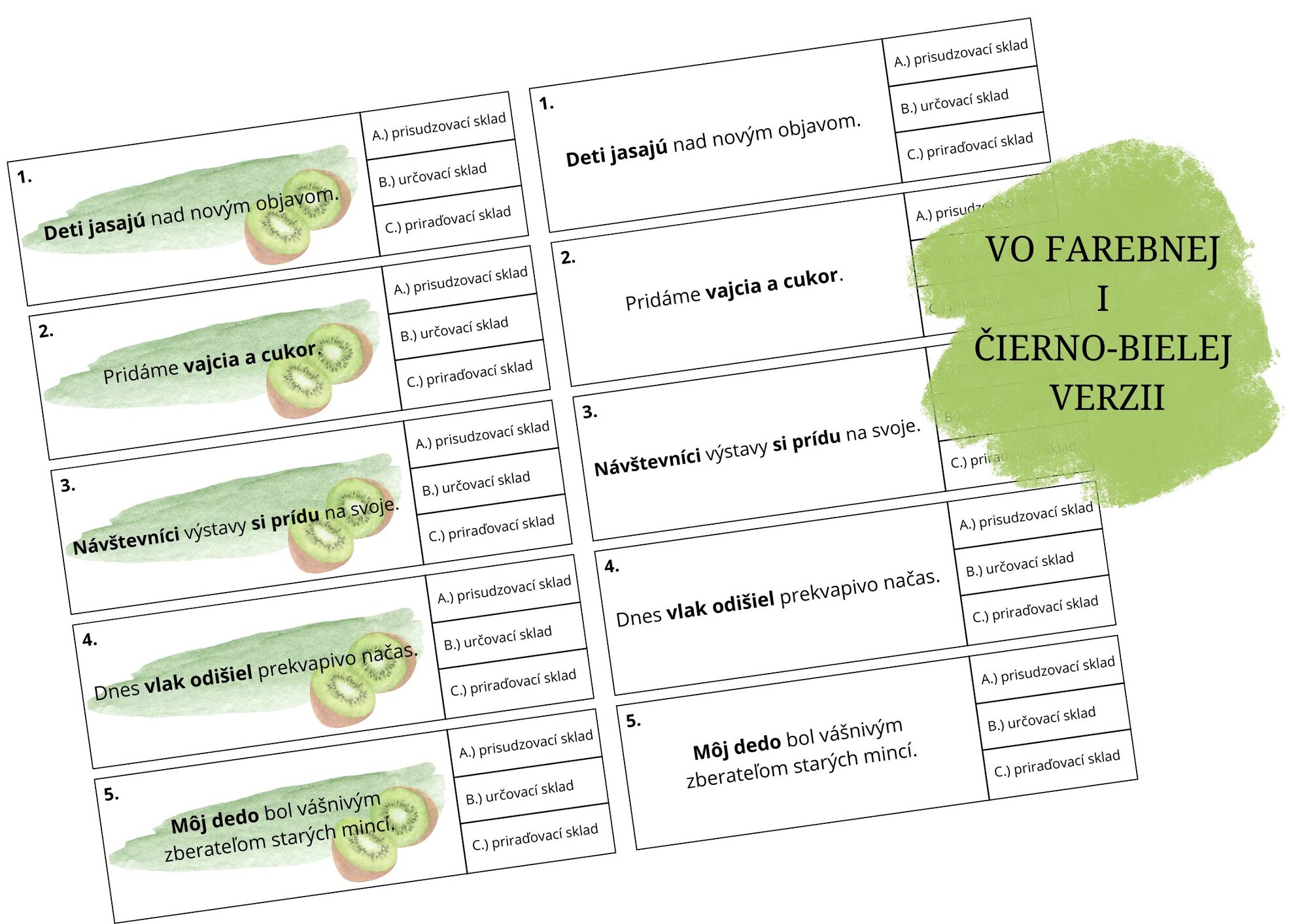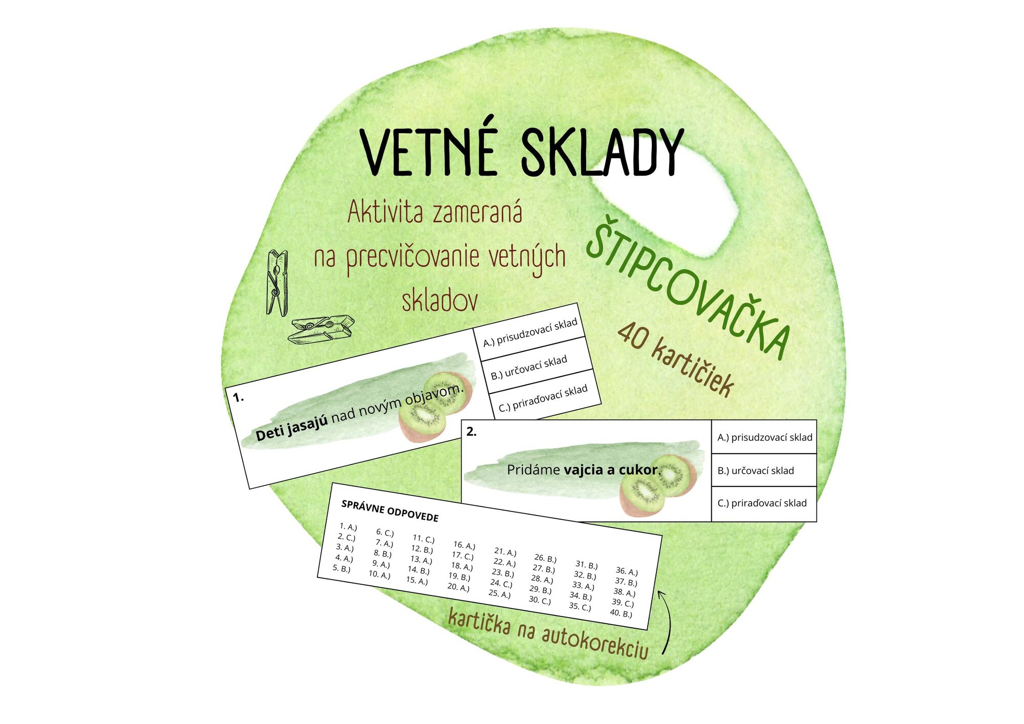 Aktivita je zameraná na precvičovanie vetných skladov. Súbor obsahuje 40 kartičiek s vetami, v ktorých sú zvýraznené vetné členy, úlohou žiaka je pomocou štipca/spinky/stierateľnej fixy správne určiť sklad medzi zvýraznenými vetnými členmi. Svoje tvrdenie si môže pomocou autokorektívnej kartičky skontrolovať.
