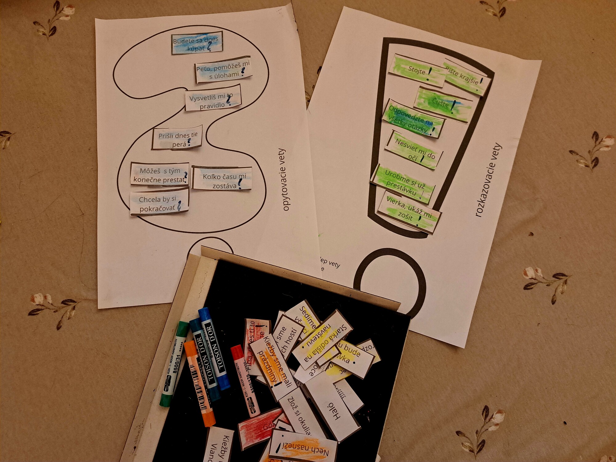 - pracovné listy so symbolmi (bodka, otáznik, výkričník ) – žiaci do nich vlepia správne vety po doplnení interpunkcie a vyfarbení podľa zadania,