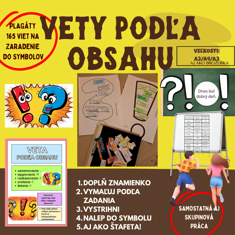 - Obsahuje: Farebné plagáty v komiksovom štýle – stručné a prehľadné vysvetlenie delenia viet podľa obsahu (oznamovacie, opytovacie, rozkazovacie, želacie, zvolacie) s príkladmi,
