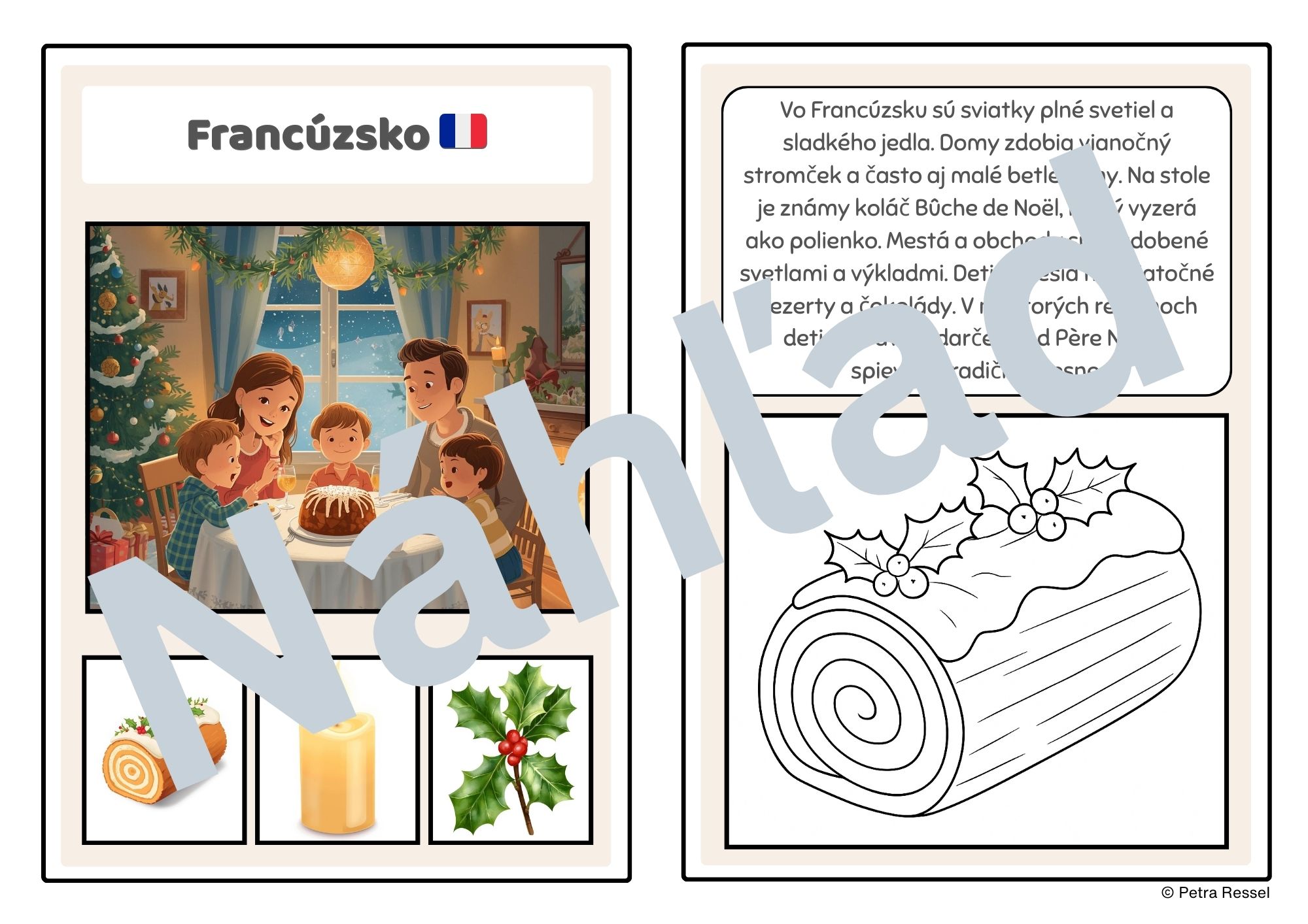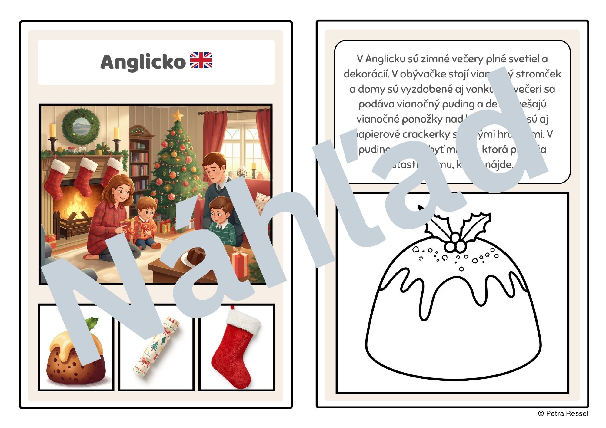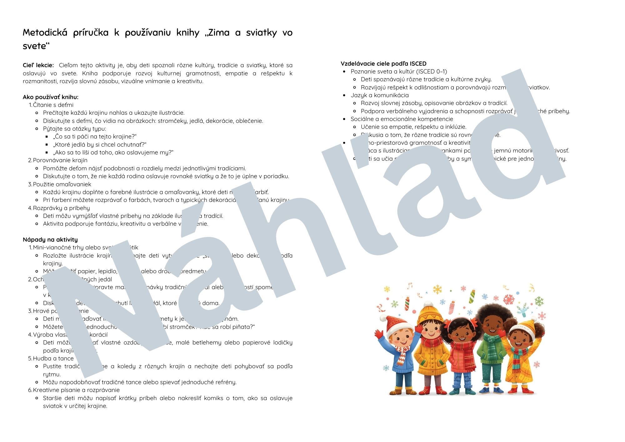 Materiál umožňuje deťom spoznať, ako sa v rôznych krajinách sveta oslavujú zima a sviatky. Každá krajina obsahuje krátky text pre deti, farebnú ilustráciu a omaľovanku, ktoré podporujú pozorovanie, kreativitu a jemnú motoriku. Brožúra obsahuje metodickú príručku pre učiteľov.