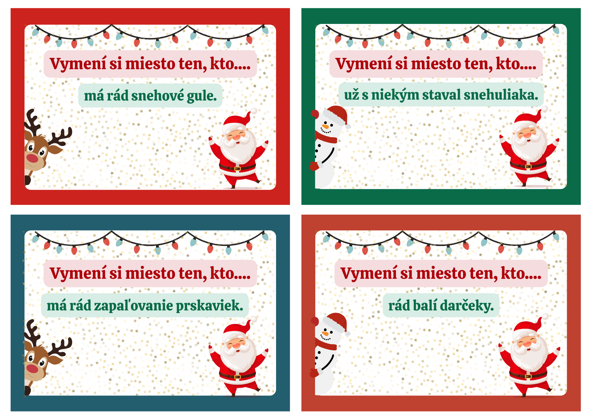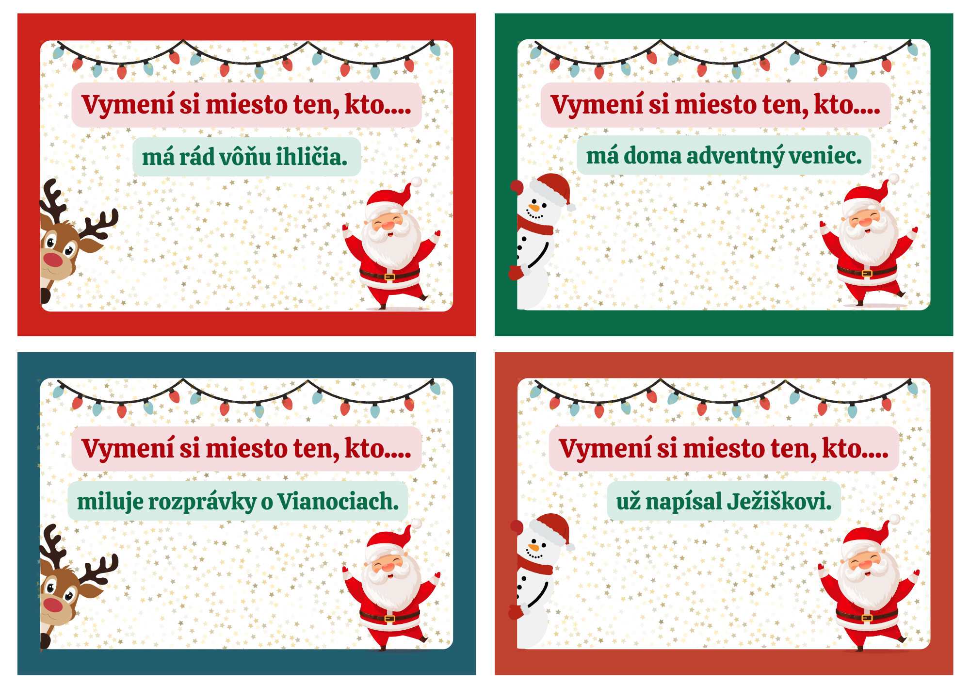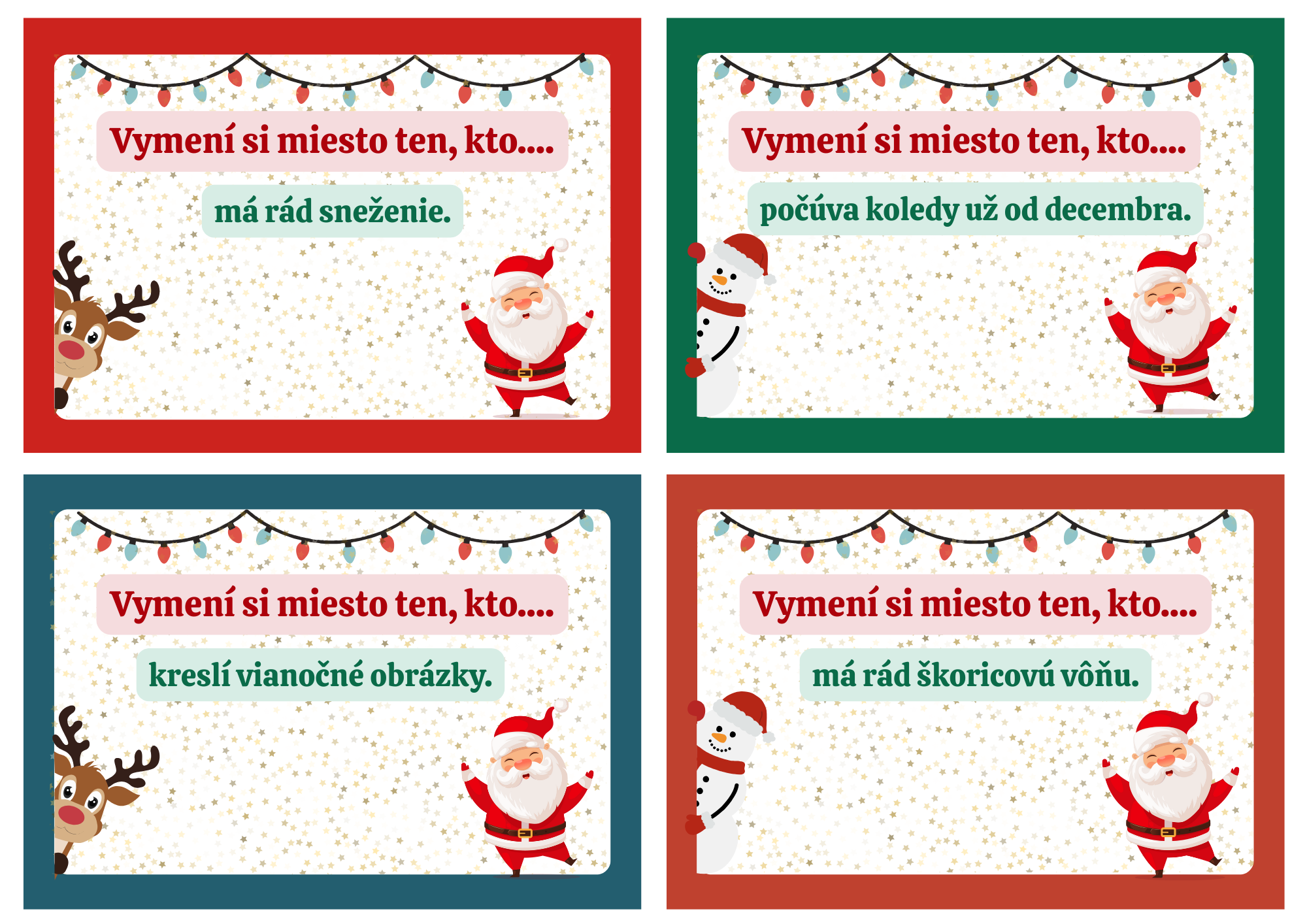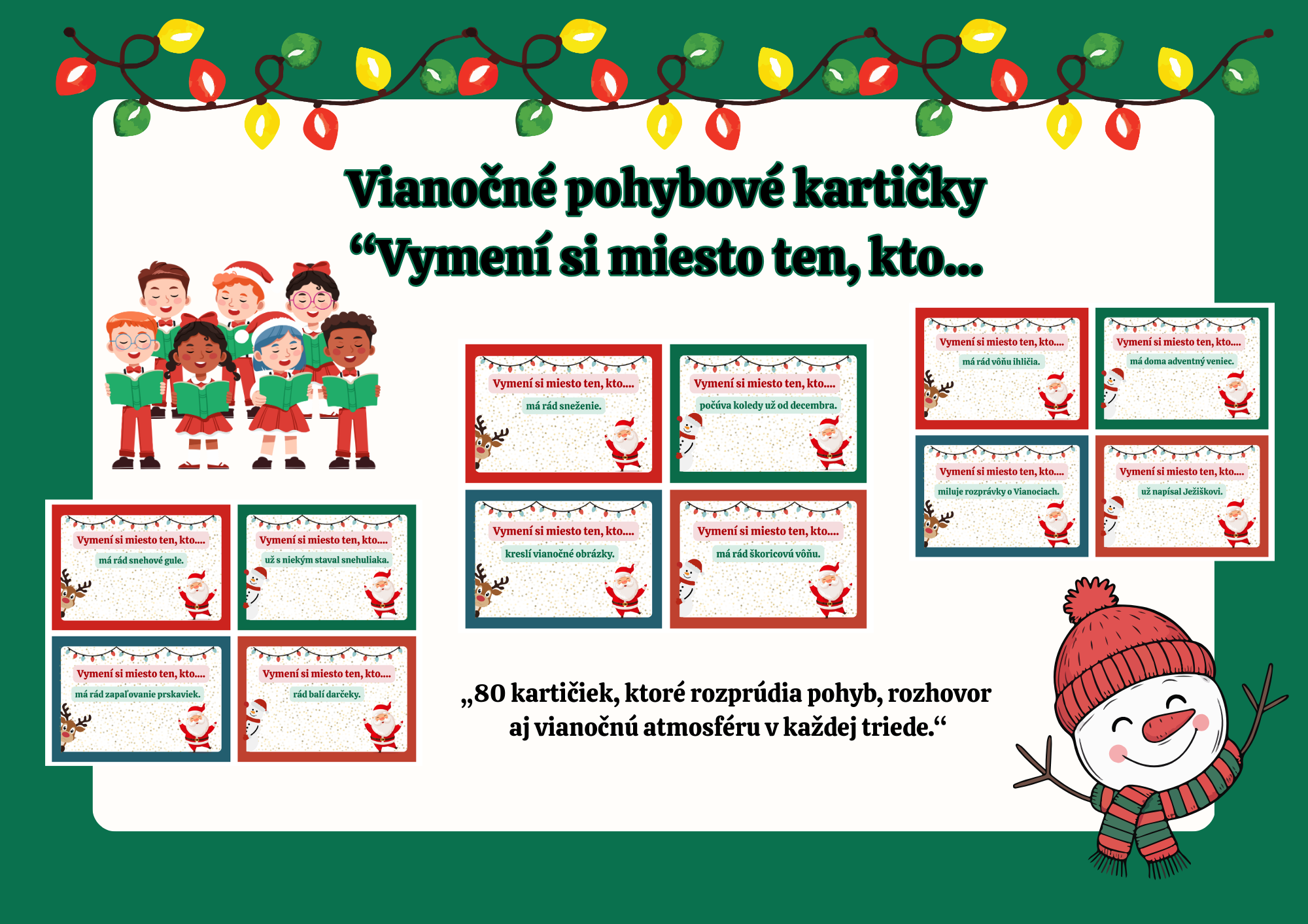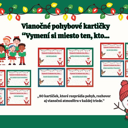 dostáva sa vám do rúk sada Vianočných pohybových kartičiek s názvom „Vymení si miesto ten, kto…“, vytvorená s cieľom priniesť do vašich tried viac radosti, pohybu a príjemnej predvianočnej atmosféry.