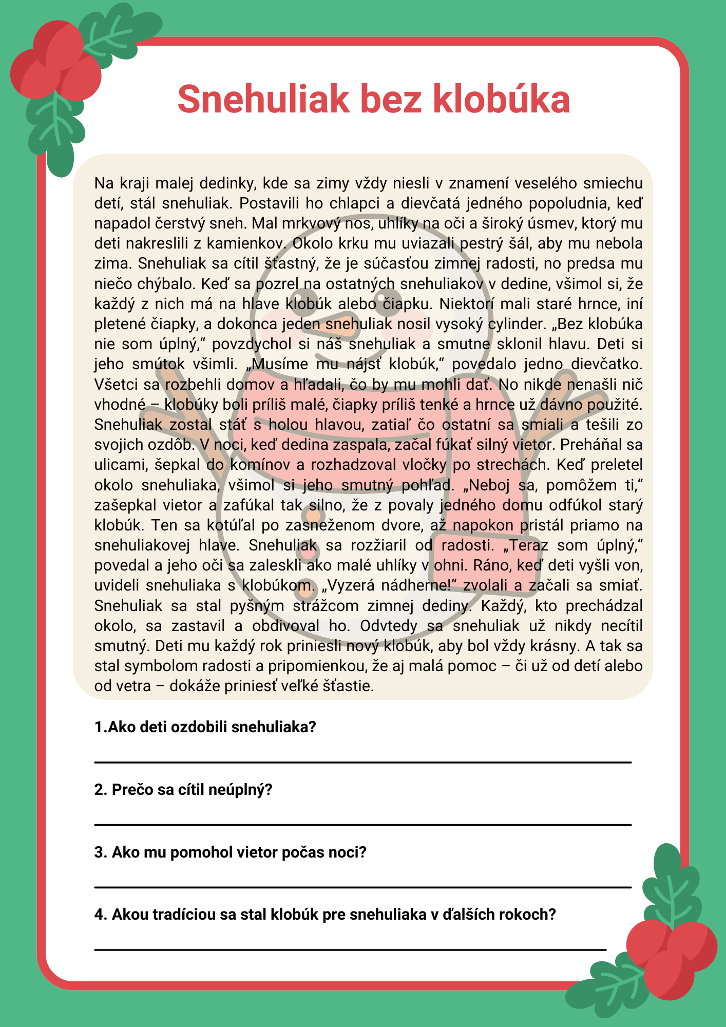 - Snehuliak bez klobúka – o snehuliakovi, ktorému vietor priniesol šťastie.