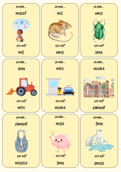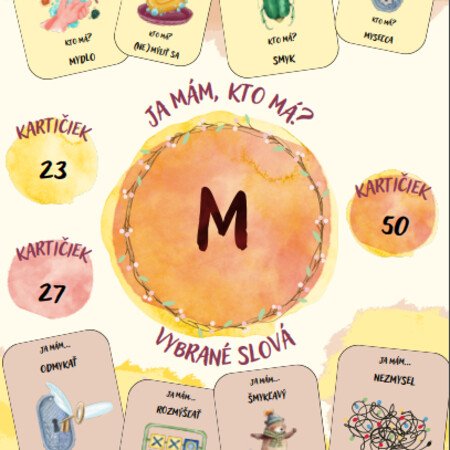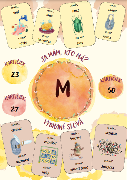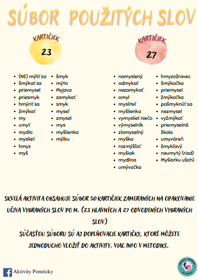 Skvelá aktivita obsahuje súbor 50 kartičiek zameraných na opakovanie učiva vybraných slov po M (23 hlavných a 27 odvodených vybraných slov).