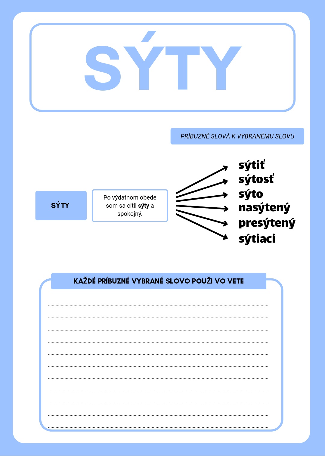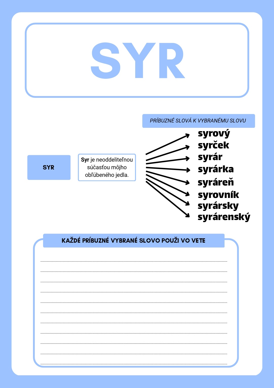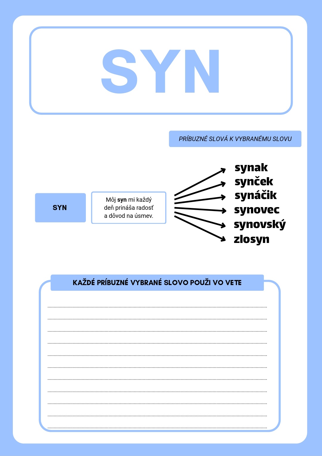 Dobrý deň, ponúkam pracovné listy zamerané na vybrané slová a ich odvodené slová. Práca s pracovnými listami upevňuje a osvojuje vybrané slová a rozširuje žiakom slovnú zásobu o odvodené vybrané slová.