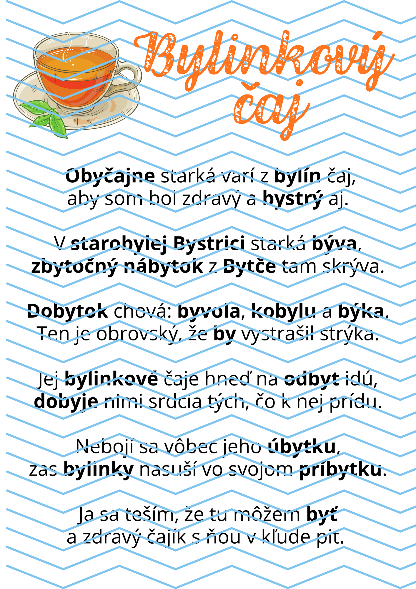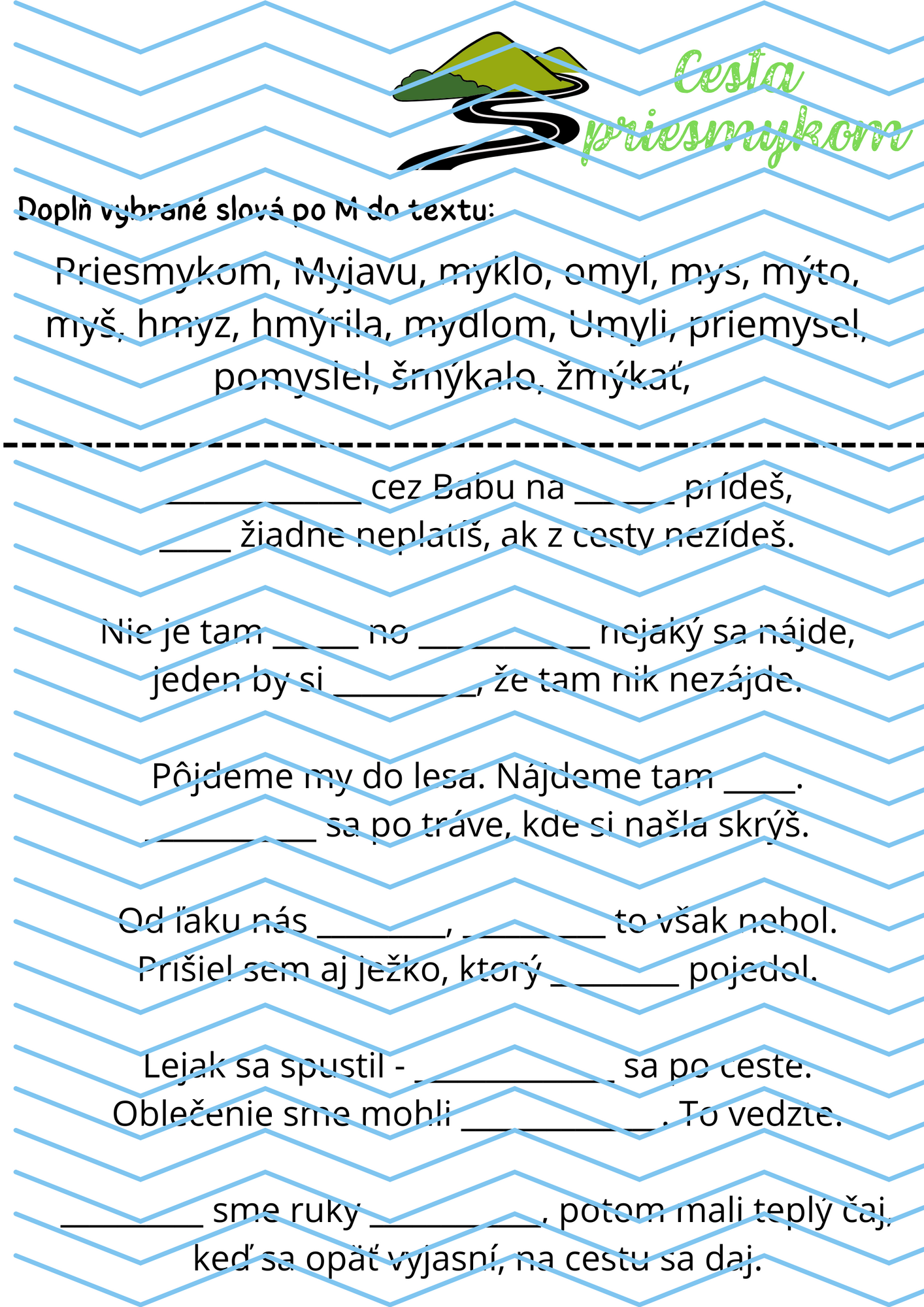 Vybrané slová, ktoré môžete dať žiakom ako básne na naučenie, alebo ako PL na dopĺňanie chýbajúcich vybraných slov podľa aktuálneho preberaného písmena. K básňam sú v balíku aj pesničky - ktoré sú zhudobnenými básničkami. Žiaci si tak môžu vypočuť, či správne doplnili vybrané slová.