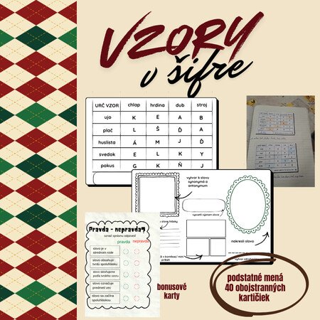 - Vzory v šifre sú hravý gramatický materiál pre 2.st. ZŠ, ktorý spája precvičovanie vzorov podstatných mien s logickým myslením, šifrovaním a tvorivou prácou so slovom.