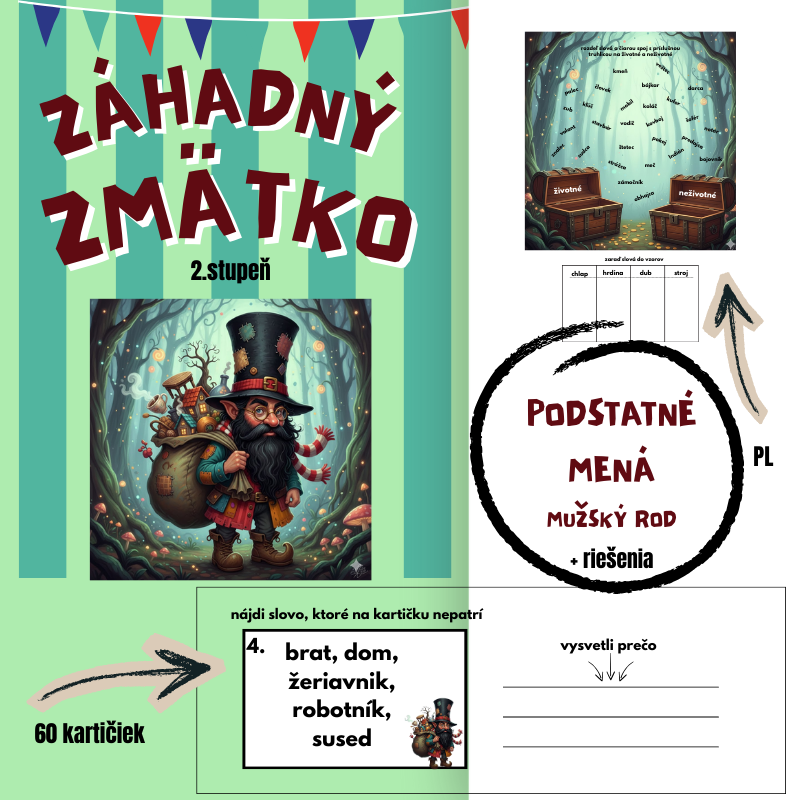 - Materiál je ideálny na opakovanie a upevňovanie učiva mužského rodu podstatných mien bez nudného memorovania vzorov – žiaci na ne prichádzajú sami.