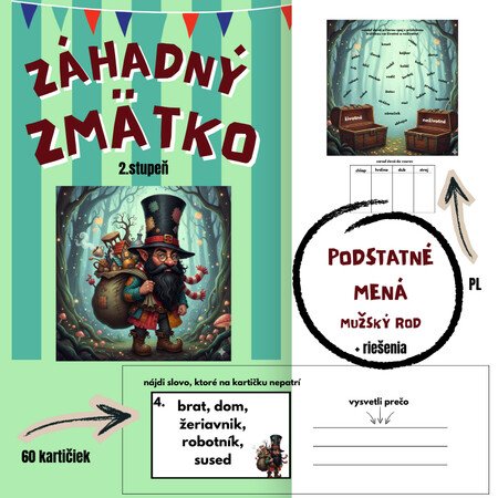 Záhadný Zmätko - podstatné mená mužského rodu, vzory/ čítanie s porozumením, tvorivé úlohy, nájdi votrelca, riešenia, logické myslenie