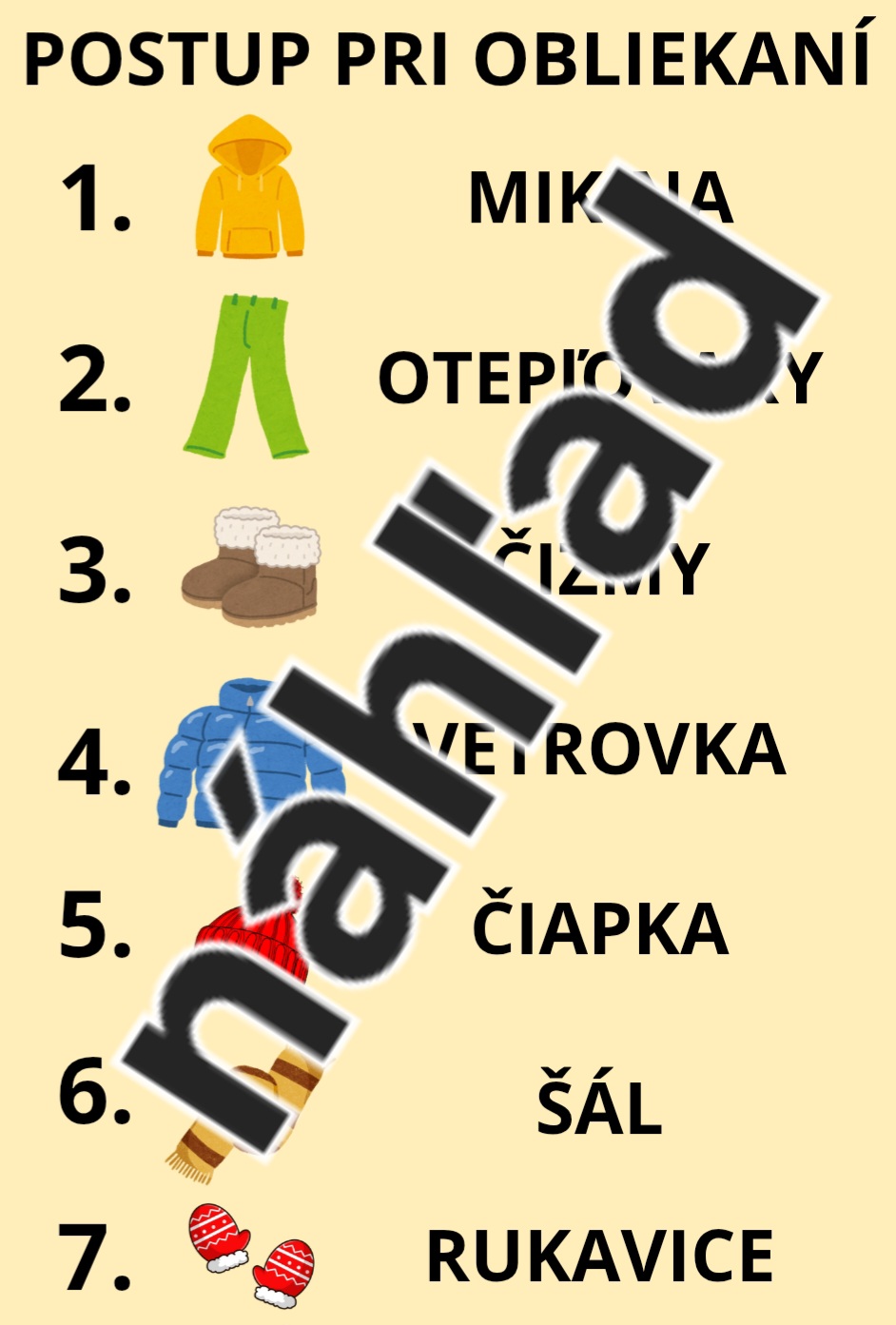Plagát - postup pri obliekaní/vyzliekaní: Sekvencie na precvičenie logického radenia a samostatnosti.