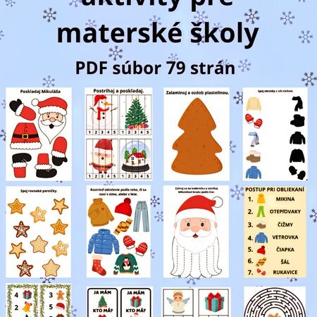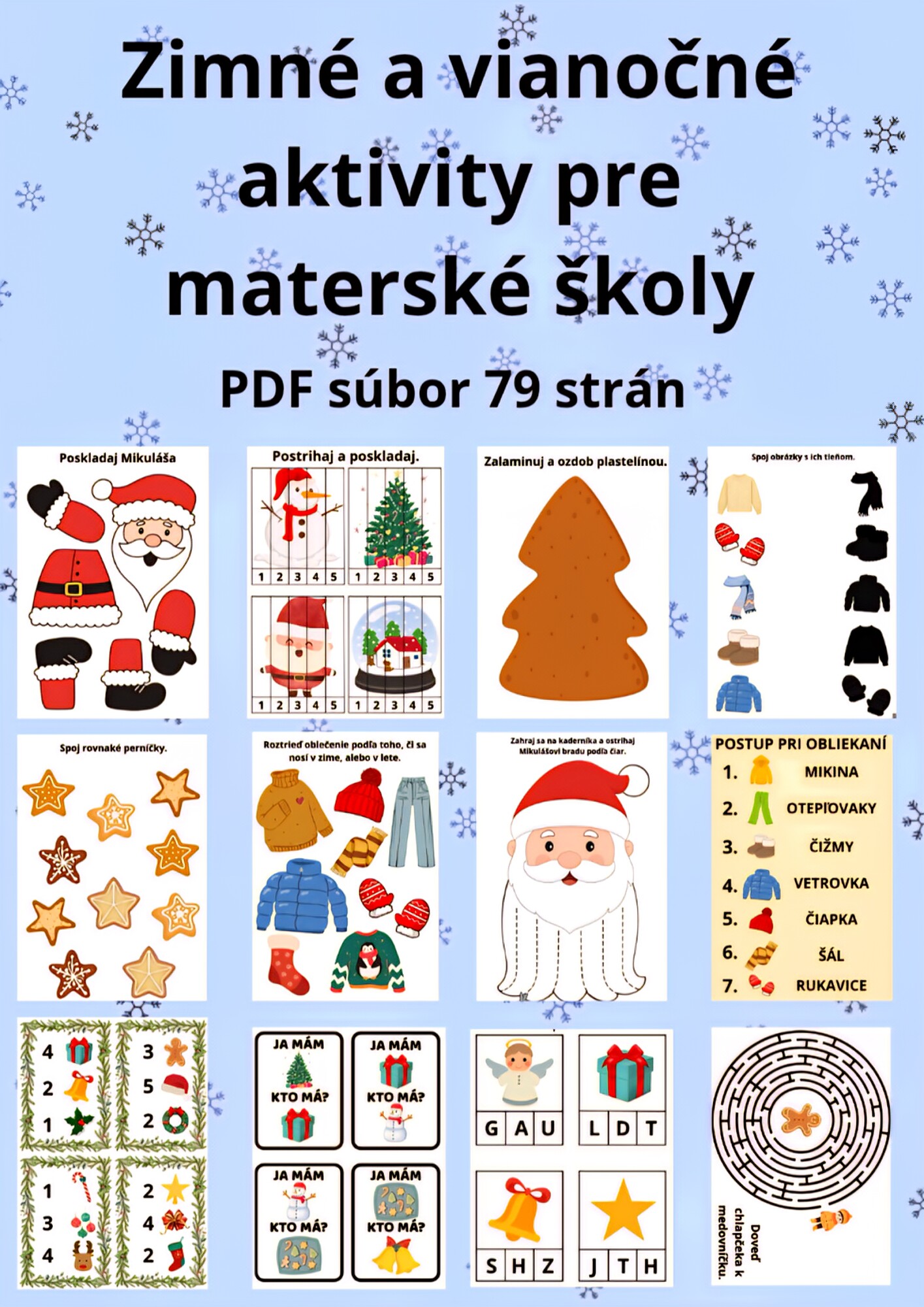 Pripravte sa na najkúzelnejšie ročné obdobie s týmto rozsiahlym balíkom aktivít! Ucelený súbor plný hravých a edukačných materiálov pre deti v materskej škole, ktoré rozvíjajú grafomotoriku, logické myslenie, jemnú motoriku, predmatematické zručnosti a slovnú zásobu. Ideálna pomôcka na výzdobu, centrá aktivít a skupinové hry počas chladných mesiacov a vianočného obdobia.