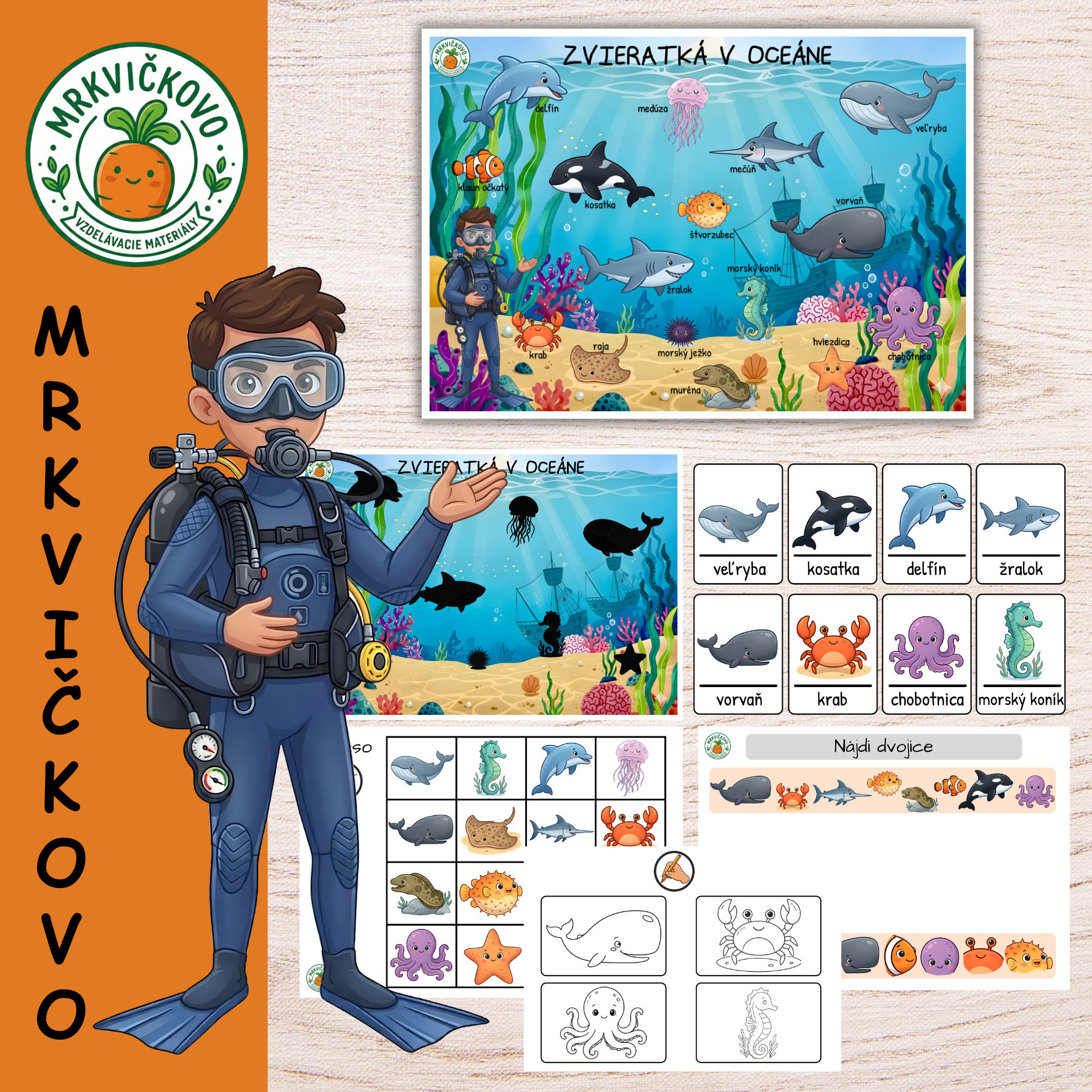 • Veľký oceánsky plagát: Krásna ilustrácia podmorského sveta s názvami zvierat (veľryba, kosatka, morský koník, klaun očkatý a ďalšie).