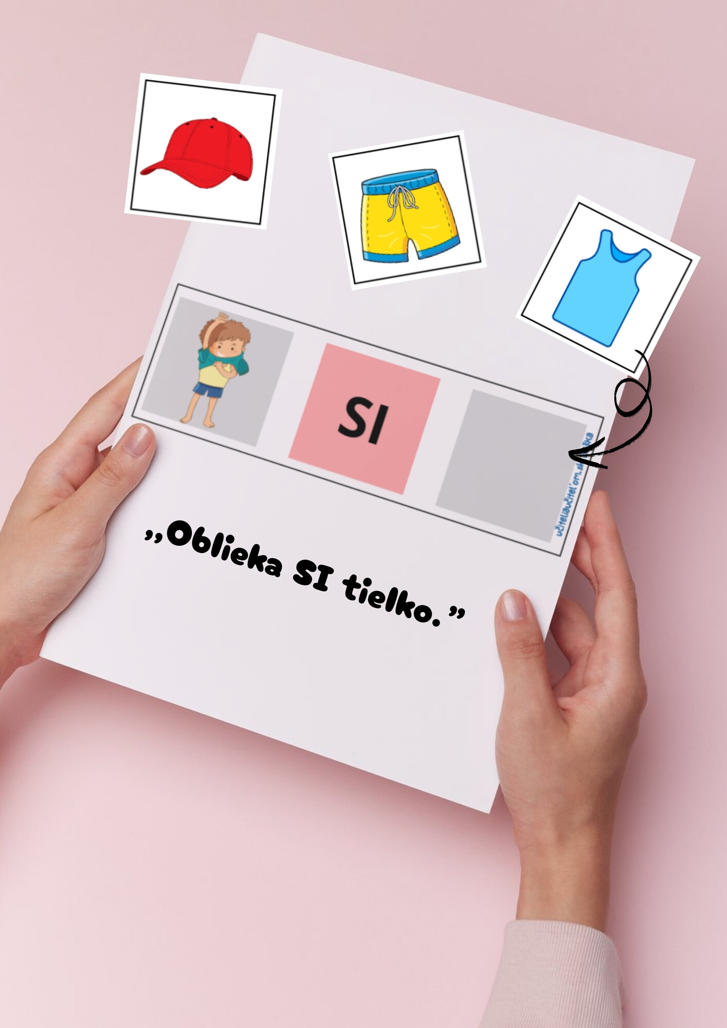 - obrázky činností, oblečenia, častí tela a zvierat, ktoré deti dopĺňajú do viet (,,Tielko - to si obliekame, alebo sa ním umývame?" - nechajte deti priraďovať správne obrázky!),