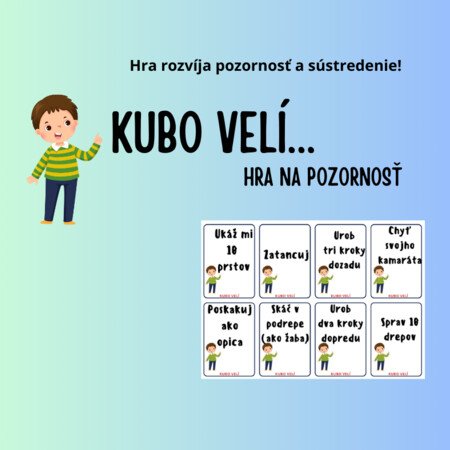- Pokyn začína formulkou: “Kubo velí...” a potom sa pridá činnosť z kartičky, napr. “Kubo velí, kľakni si na kolená!”.