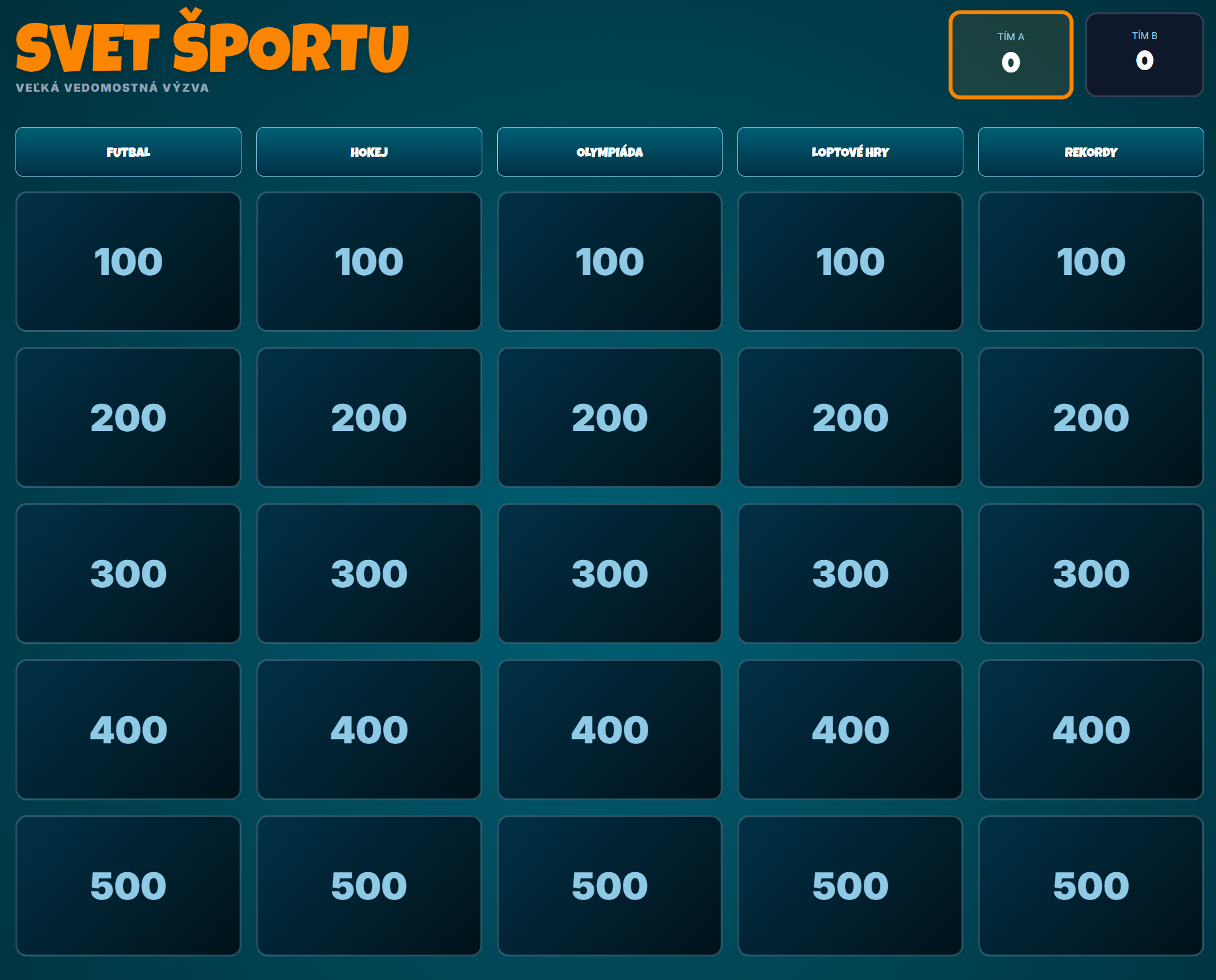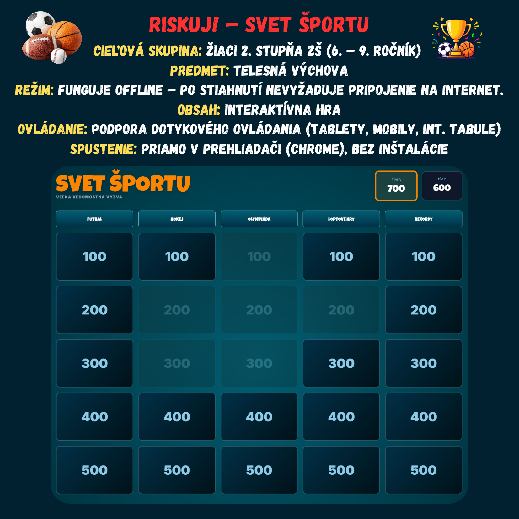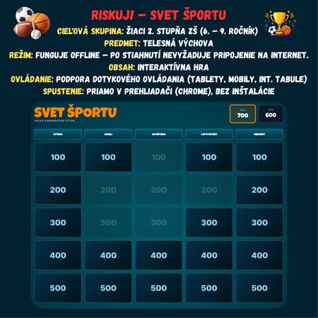 Premeňte hodinu telesnej výchovy alebo prírodovedy na napínavý súboj vedomostí! Táto digitálna hra prenáša obľúbený formát televíznej súťaže Riskuj! priamo do vašej triedy. Žiaci sa hravou formou ponoria do detailov športovej histórie, pravidiel a zaujímavostí, od olympijských kruhov až po svetové rekordy.