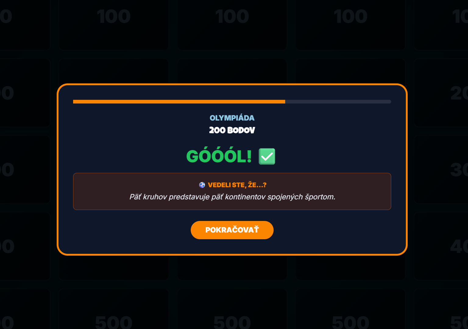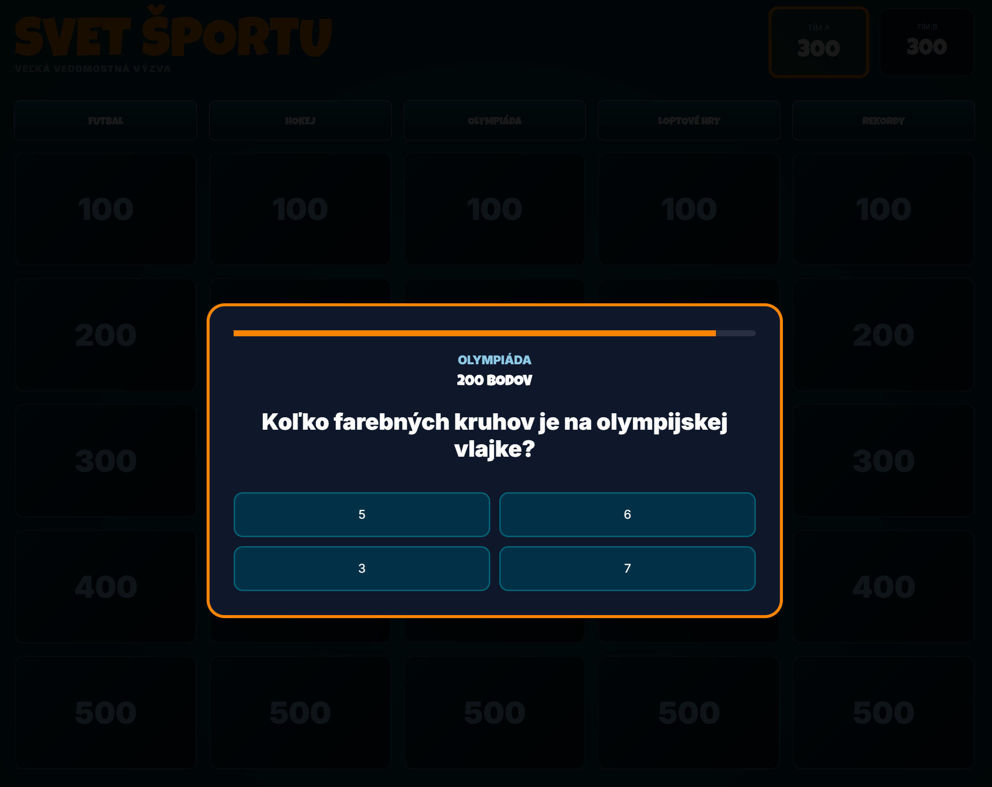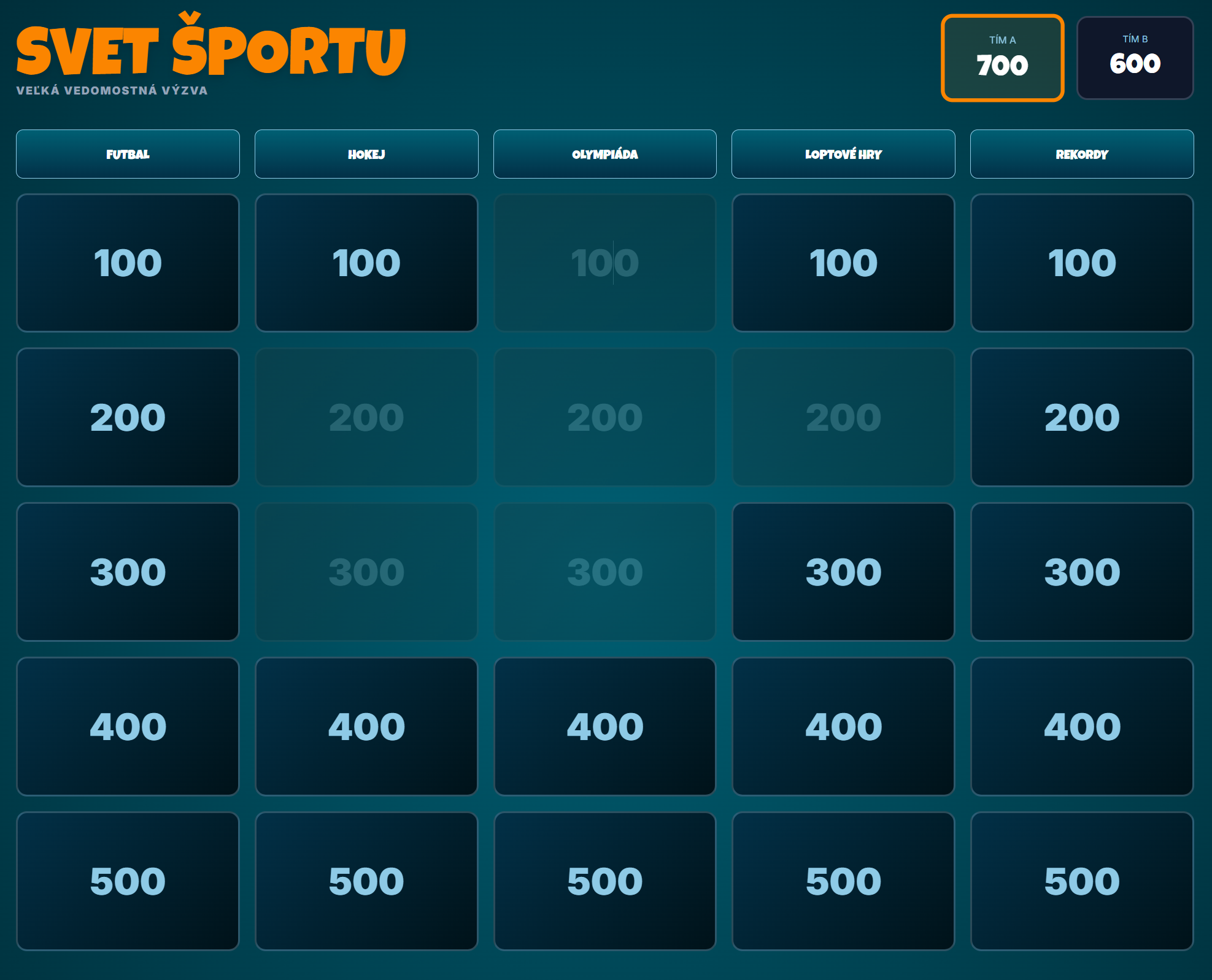 - 25 odborných otázok: Rozdelených do kategórií Futbal, Hokej, Olympiáda, Loptové hry a Rekordy.