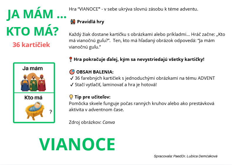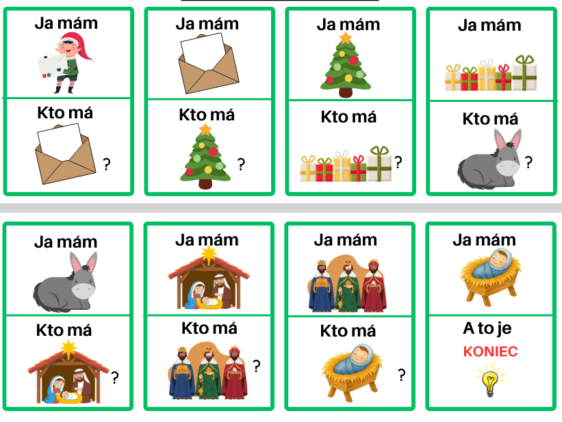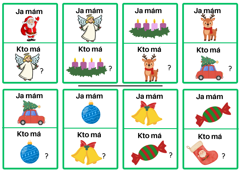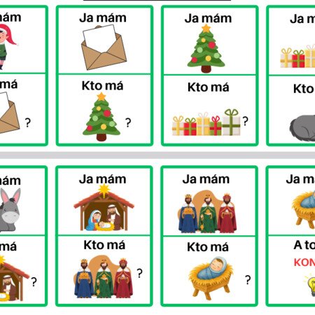 Každý žiak dostane kartičku s obrázkami alebo príkladmi... Hráč začne: „Kto má vianočnú guľu?”. Ten, kto má hľadaný obrázok odpovedá: “Ja mám vianočnú guľu.”