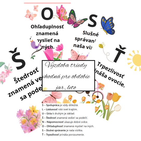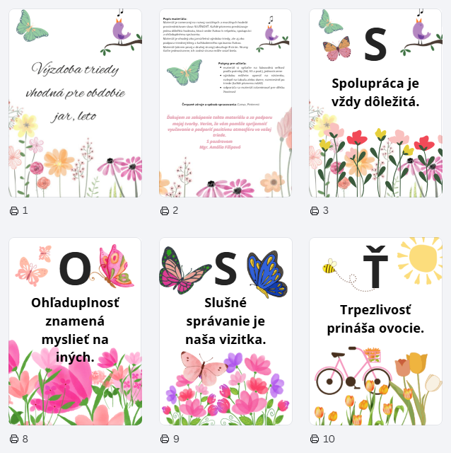 Materiál je vhodný ako jarná/letná výzdoba triedy, ale aj ako podpora triednej klímy a každodenného správania žiakov. Materiál (okrem prvej a druhej strany) obsahuje 8 strán. Strany tlačte jednostranne, ich zadná strana môže ostať biela.