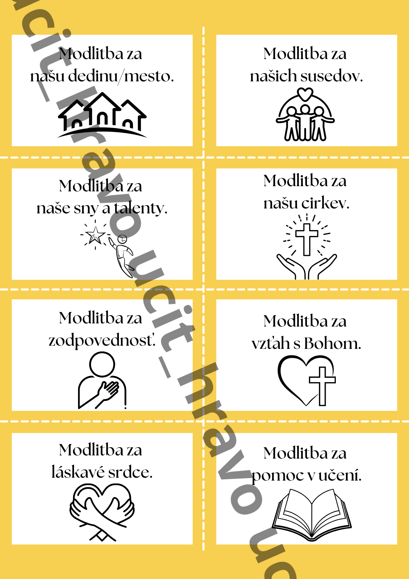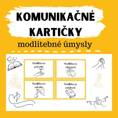 40 komunikačných kartičiek s modtlitebnými námetmy. Kartičky je vhodné využiť na rannej komunite v cirkevných školách či počas hodín náboženskej výchovy. Slúžia ako úmysly na modlitby. Niekto vyberie kartičku a celá skupina sa za daný úmysel modlí, alebo si každý sám vyberie za čo sa bude modliť.