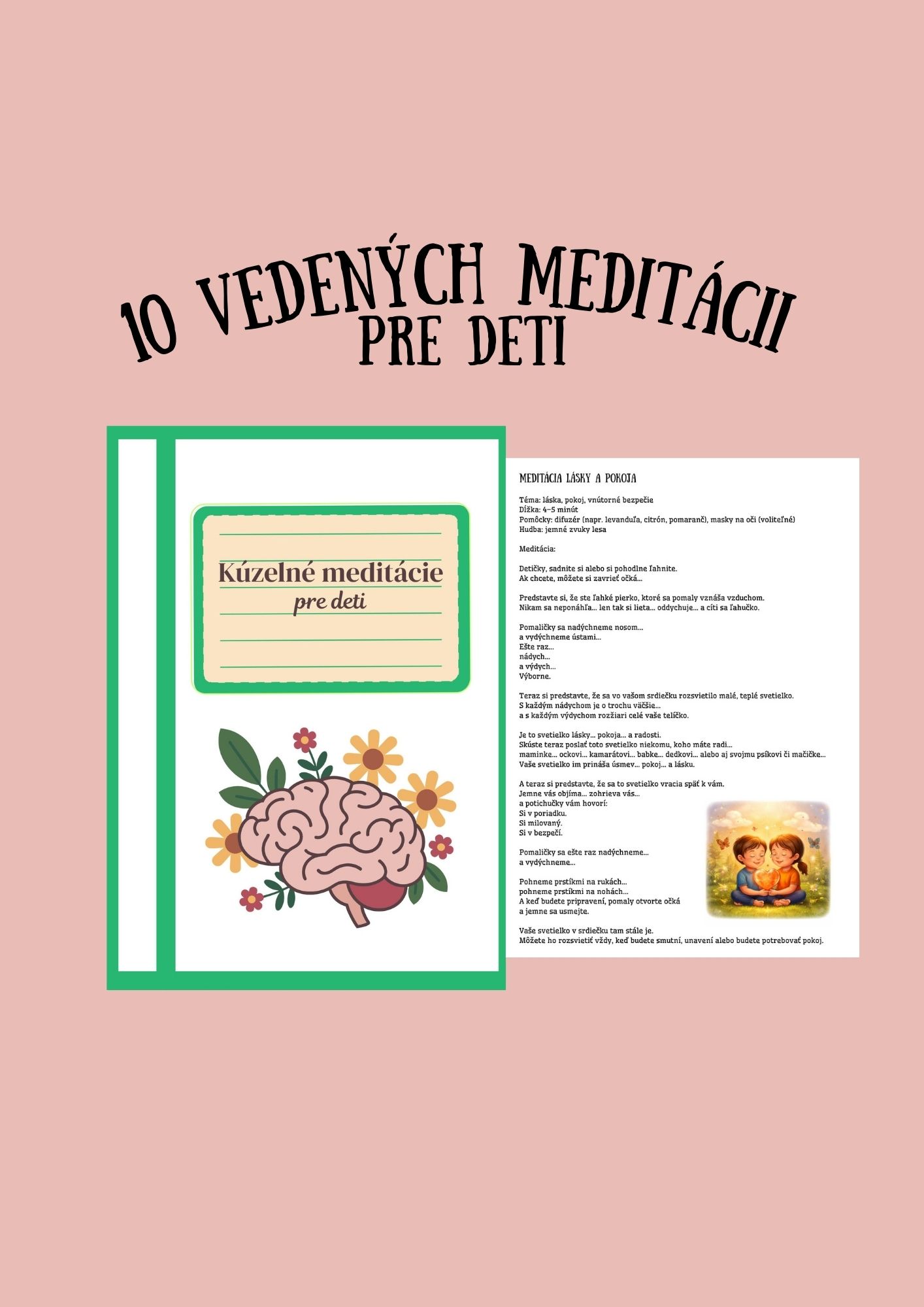 - 10 krátkych vedených meditácií pre deti vo veku približne 3 – 8 rokov, každá v dĺžke 3 – 5 minút.