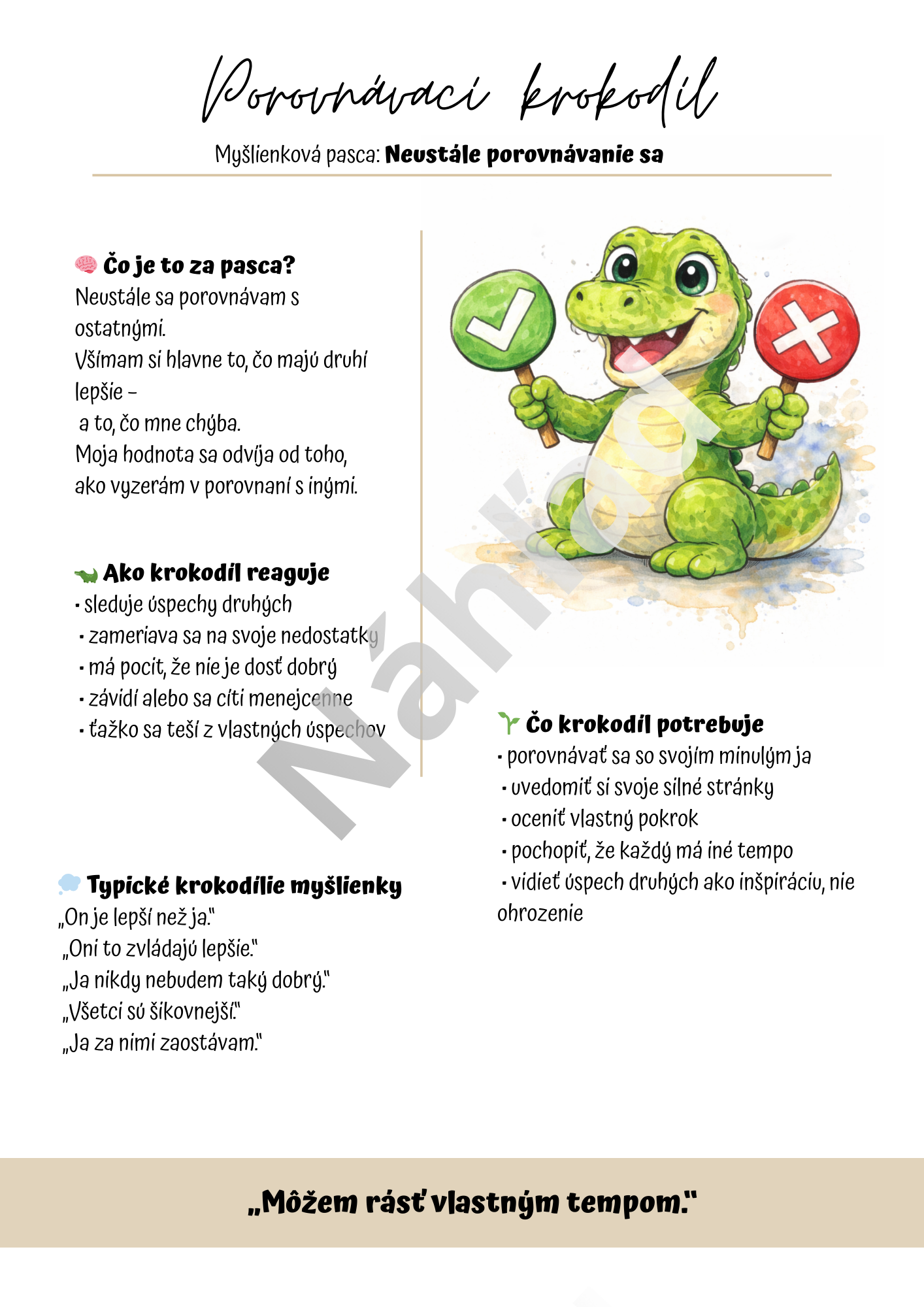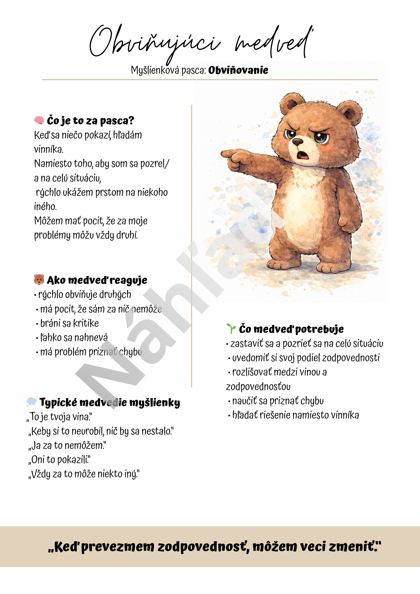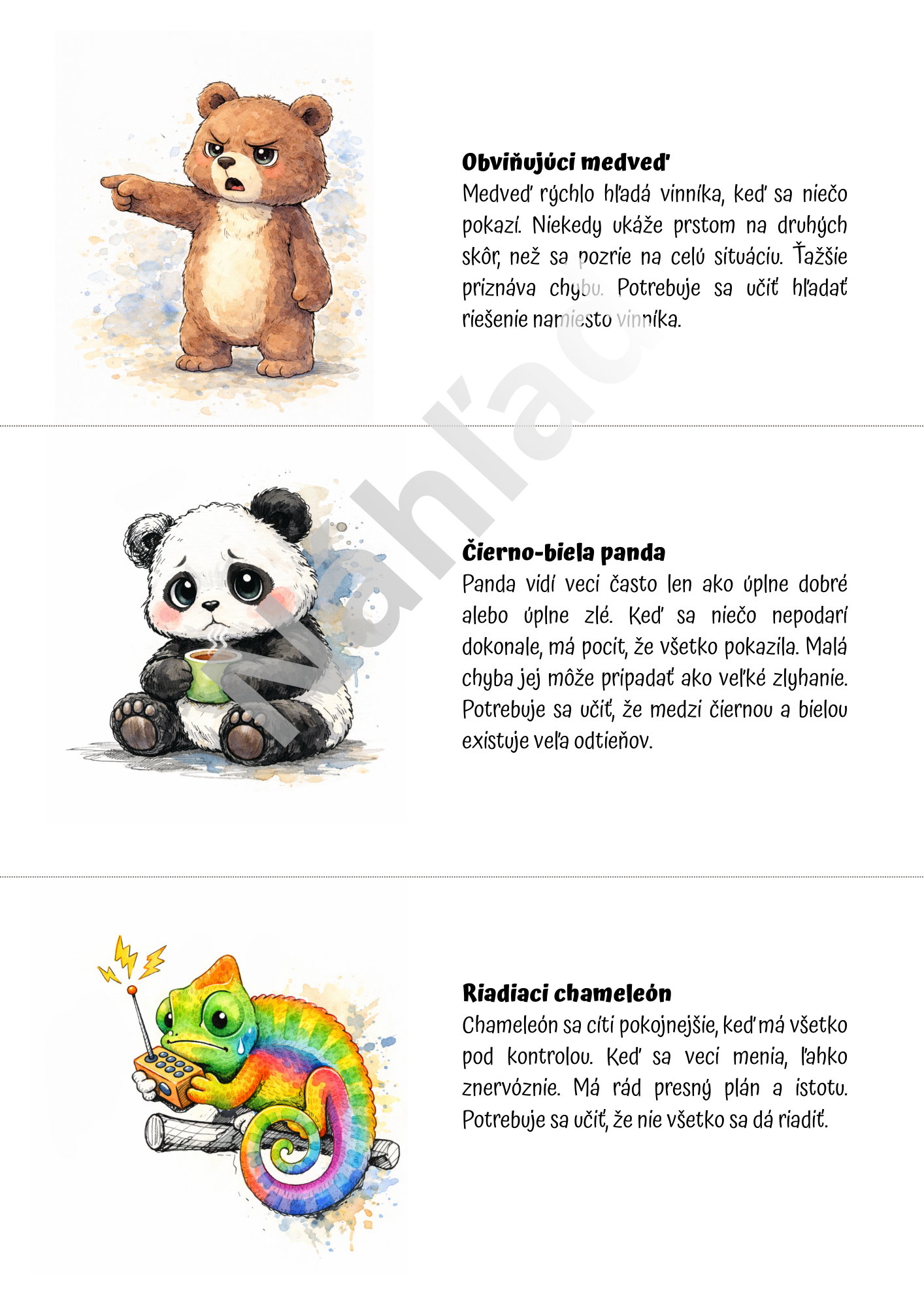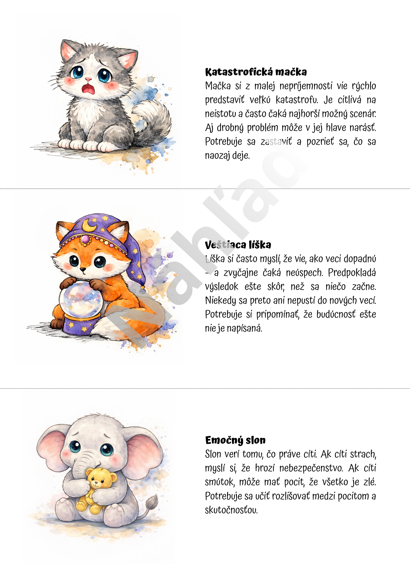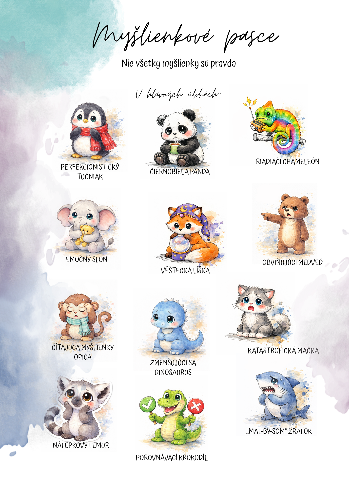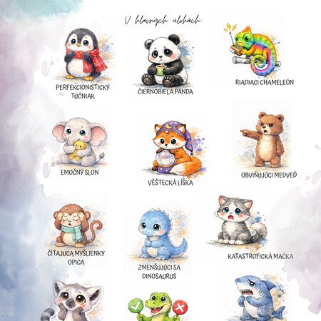 Pomocou originálnych zvieracích postáv deti prirodzene objavujú, že nie každá myšlienka je pravda a že naše prežívanie často ovplyvňuje spôsob, akým si udalosti vysvetľujeme. Každá postava predstavuje konkrétnu myšlienkovú pascu – napríklad katastrofizovanie, perfekcionizmus, porovnávanie sa, čítanie myšlienok, potrebu kontroly, obviňovanie či emočné usudzovanie