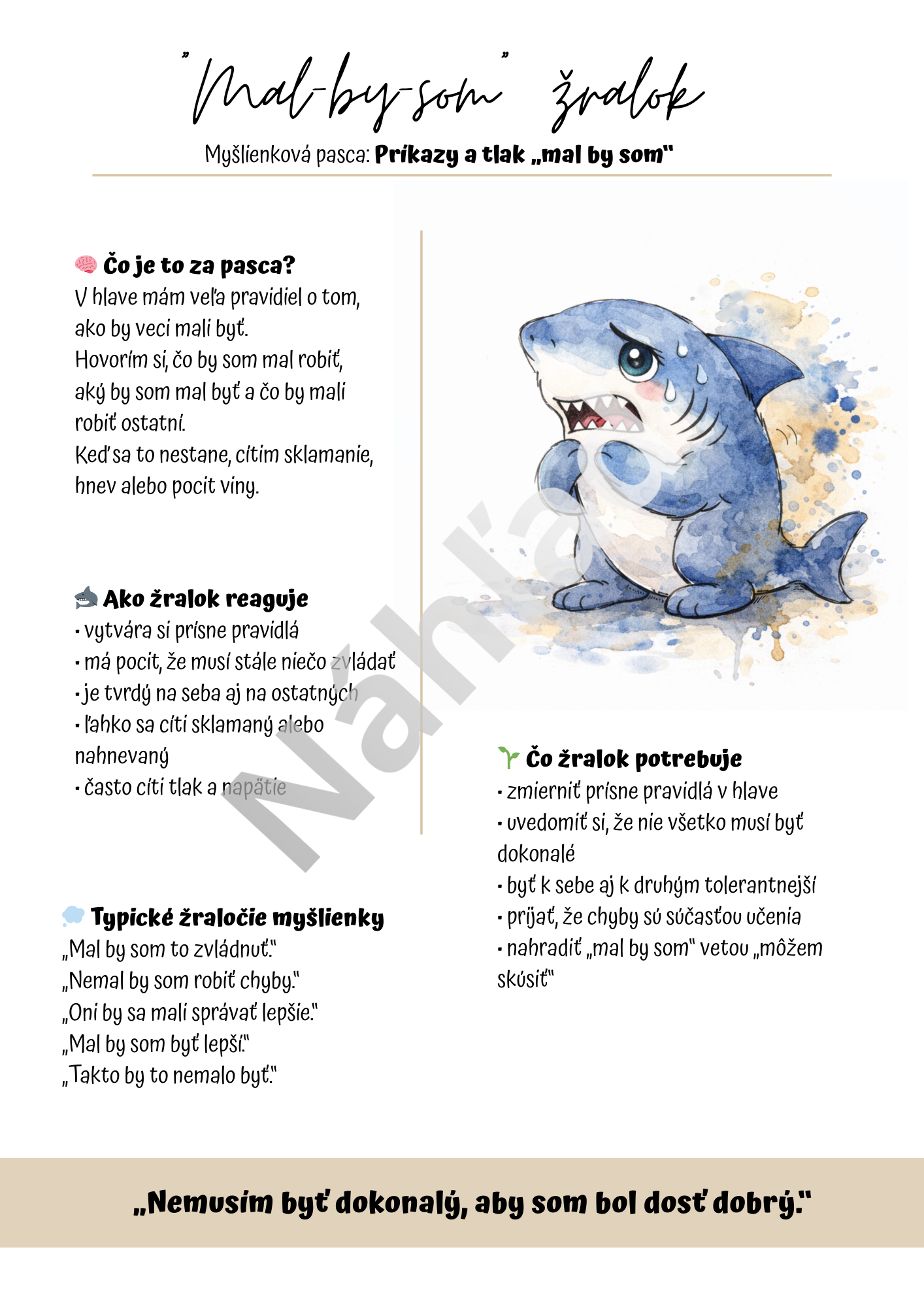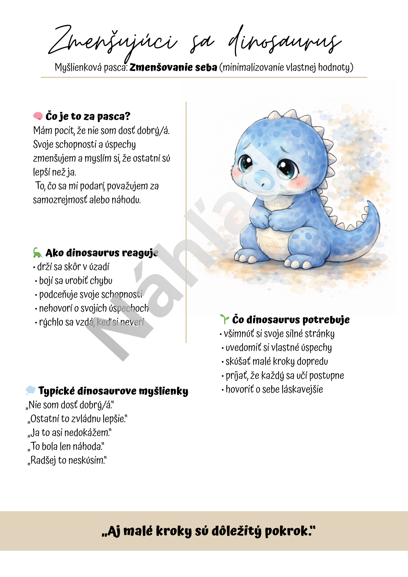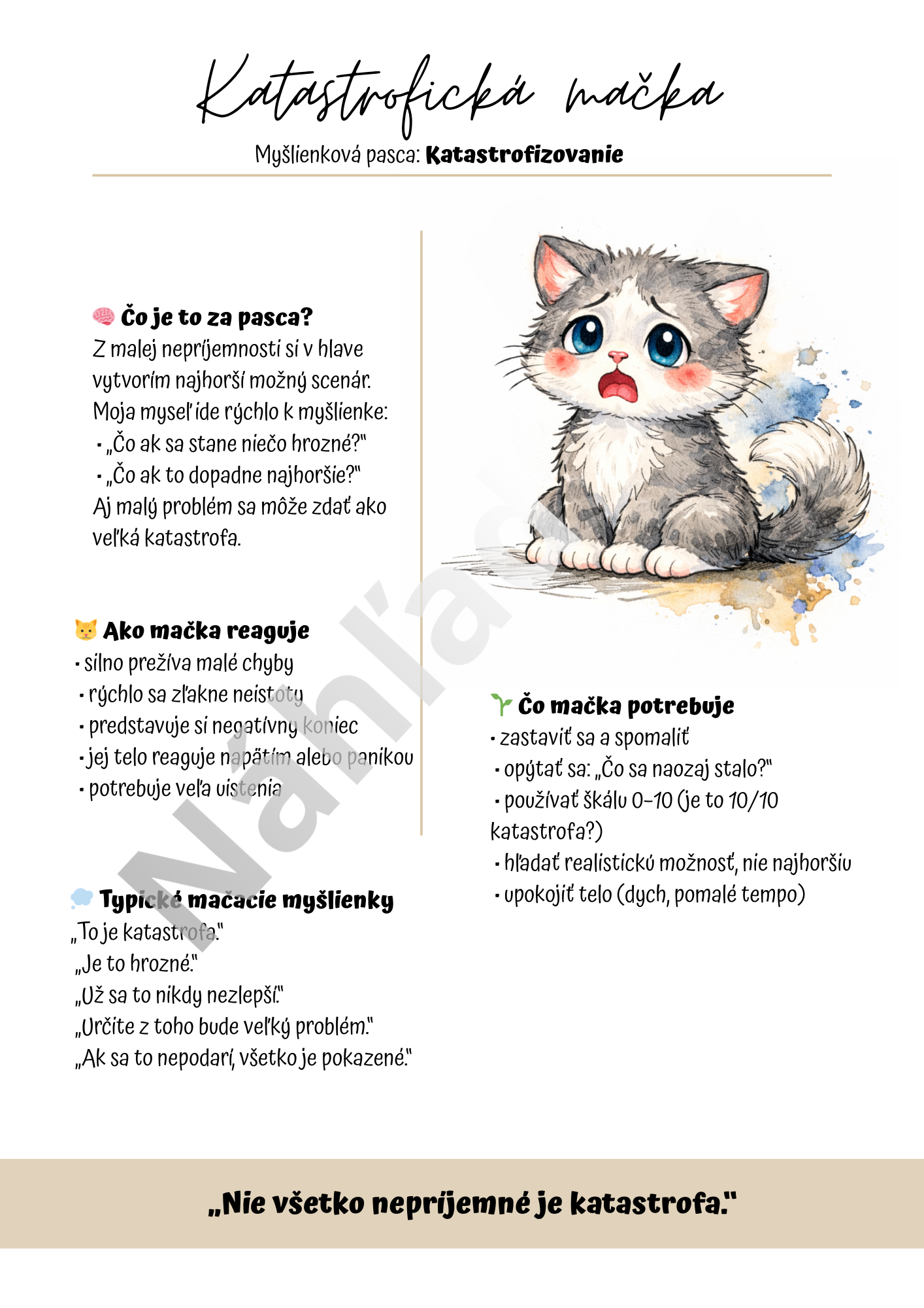 Materiál Myšlienkové pasce je vizuálne spracovaný edukačno-terapeutický súbor, ktorý pomáha deťom porozumieť vlastnému premýšľaniu, rozpoznávať nefunkčné myšlienkové vzorce a postupne sa učiť zdravším spôsobom reagovať na náročné situácie.