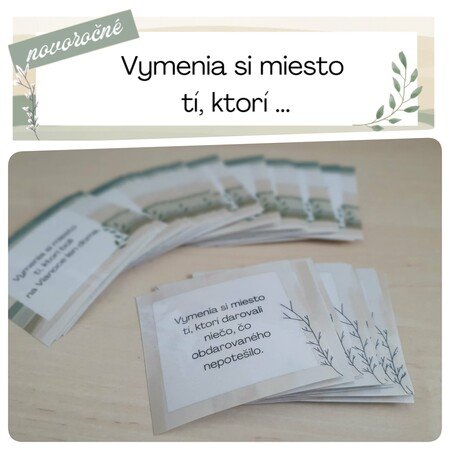 Dobrý deň, v PDF nájdete 54 kartičiek s otázkami na novoročnú hru Vymenia si miesto tí, ktorí..., v ktorej takto spolu hravo pospomínate na uplynulé vianočné obdobie a začiatok nového roka.