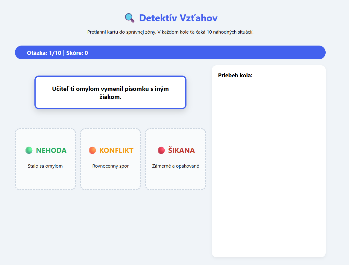 - 2. Interaktívna HTML hra „Detektív vzťahov“: Žiaci v prehliadači triedia 50 reálnych situácií. Hra náhodne generuje 10 otázok v každom kole, obsahuje okamžitú spätnú väzbu a vysvetlenia „Prečo?“. Ideálne na interaktívnu tabuľu alebo tablety.
