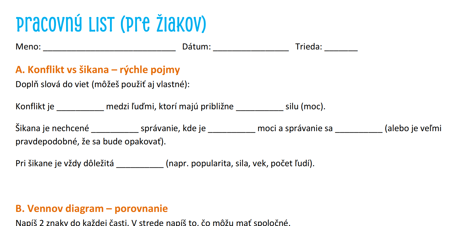 - 4. Pracovný list a príbeh : Príbeh zo života, ktorý slúži na nácvik čítania s porozumením a rozvoj kritického myslenia. Pracovný list pomáha žiakom analyzovať role v šikane (agresor, obeť, svedok).