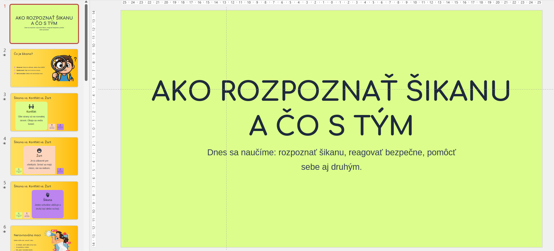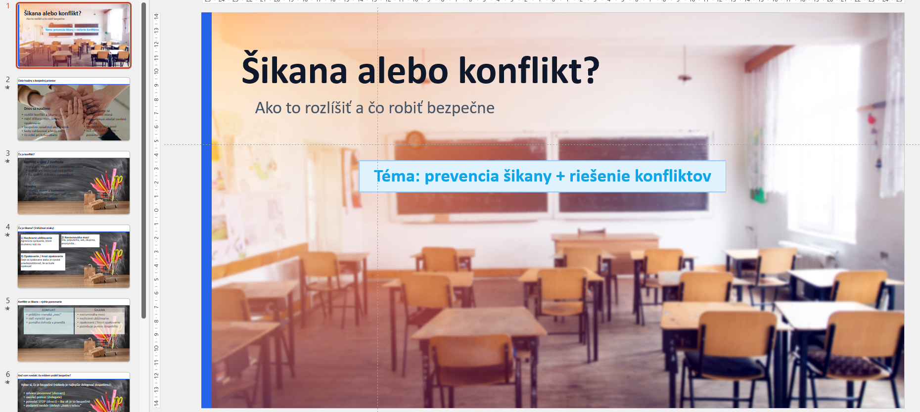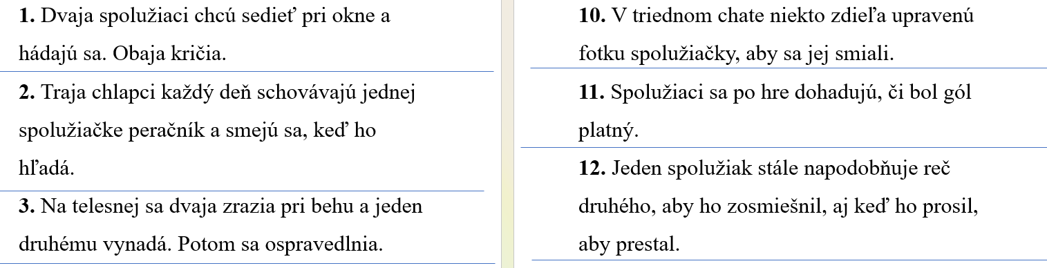 - 1. Prezentácia: Prehľadný vizuálny sprievodca, ktorý jasne definuje rozdiel medzi šikanou, konfliktom a náhodnou nehodou.