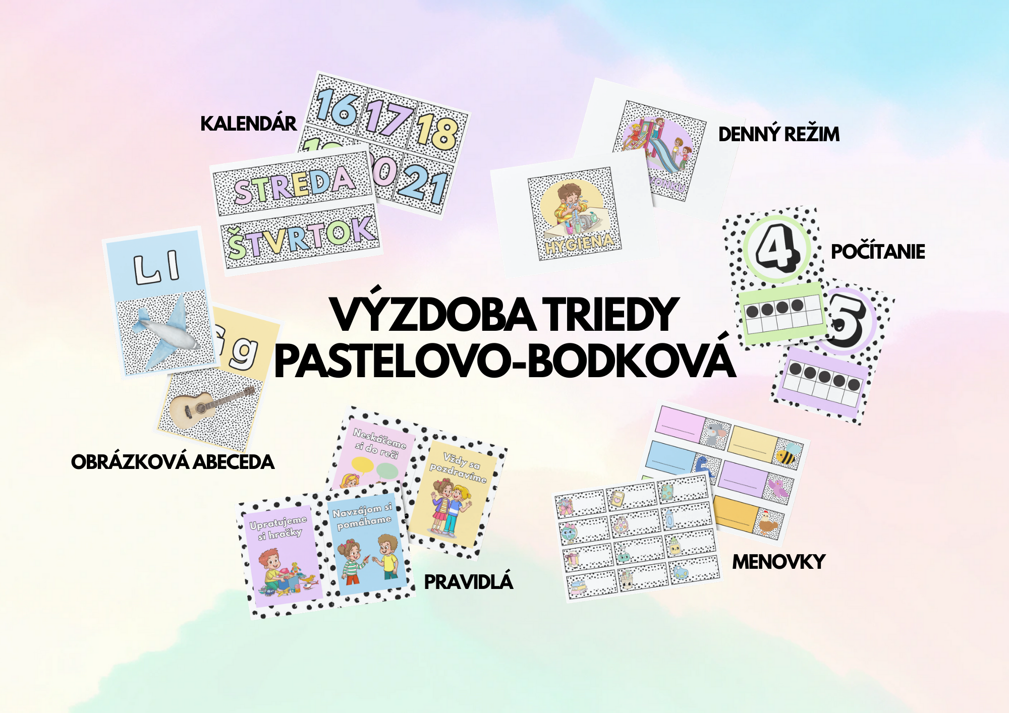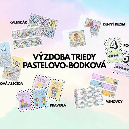Výzdoba a dekorácia triedy s pastelovo-bodkovaným moderným vzorom. Má až 128 strán. Súbor je vhodný na nástenku, na výzdobu triedy, na zalaminovanie...