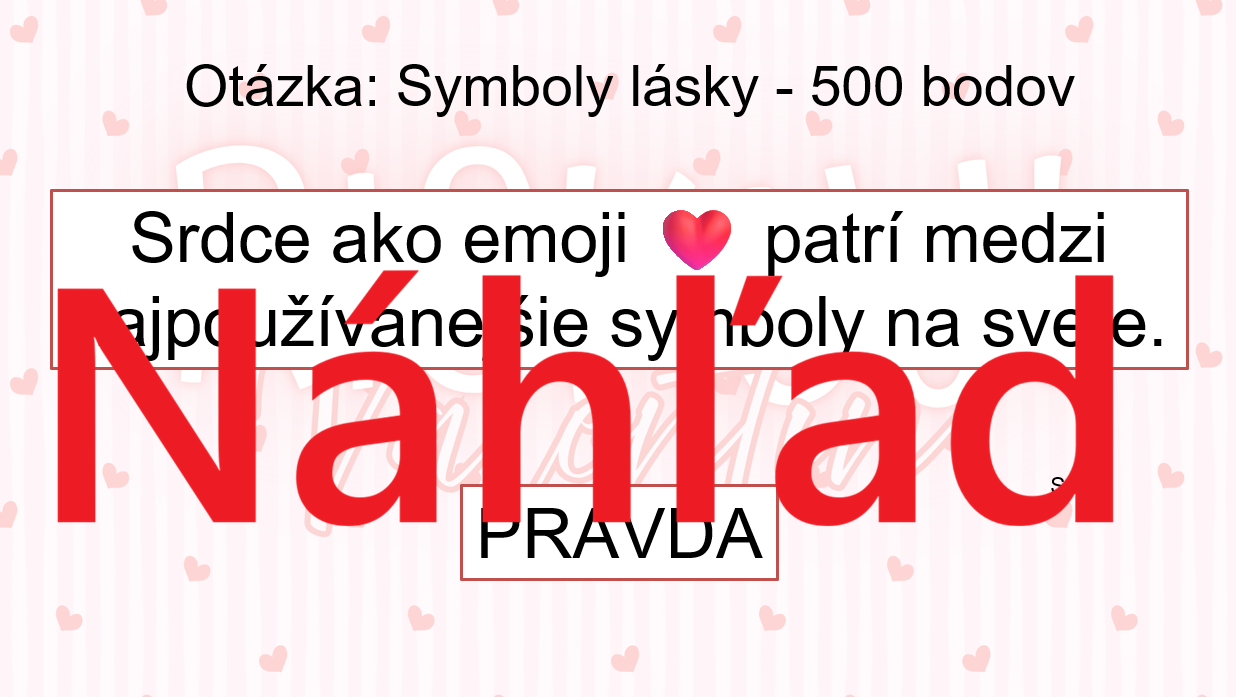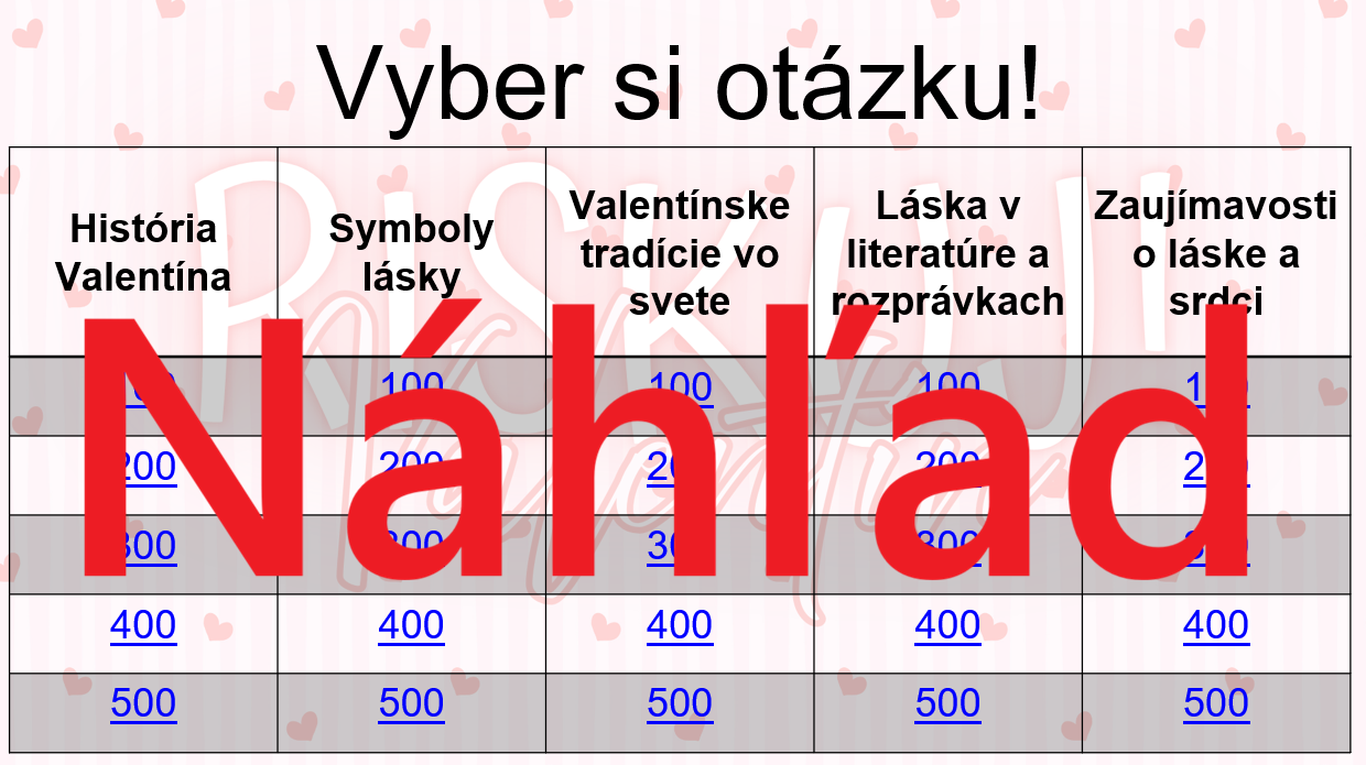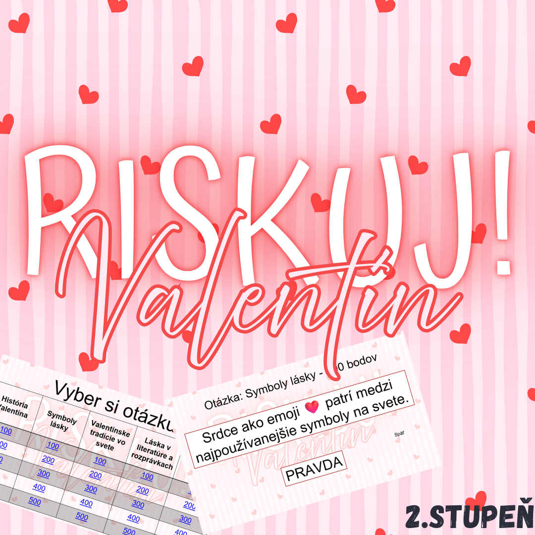 Materiál „RISKUJ! – Valentín“ je interaktívna a súťažná edukačná hra určená pre žiakov 2. stupňa základnej školy. Hravou formou pomáha rozšíriť vedomosti o sviatku svätého Valentína, jeho histórii, symbolike a kultúrnych tradíciách vo svete.