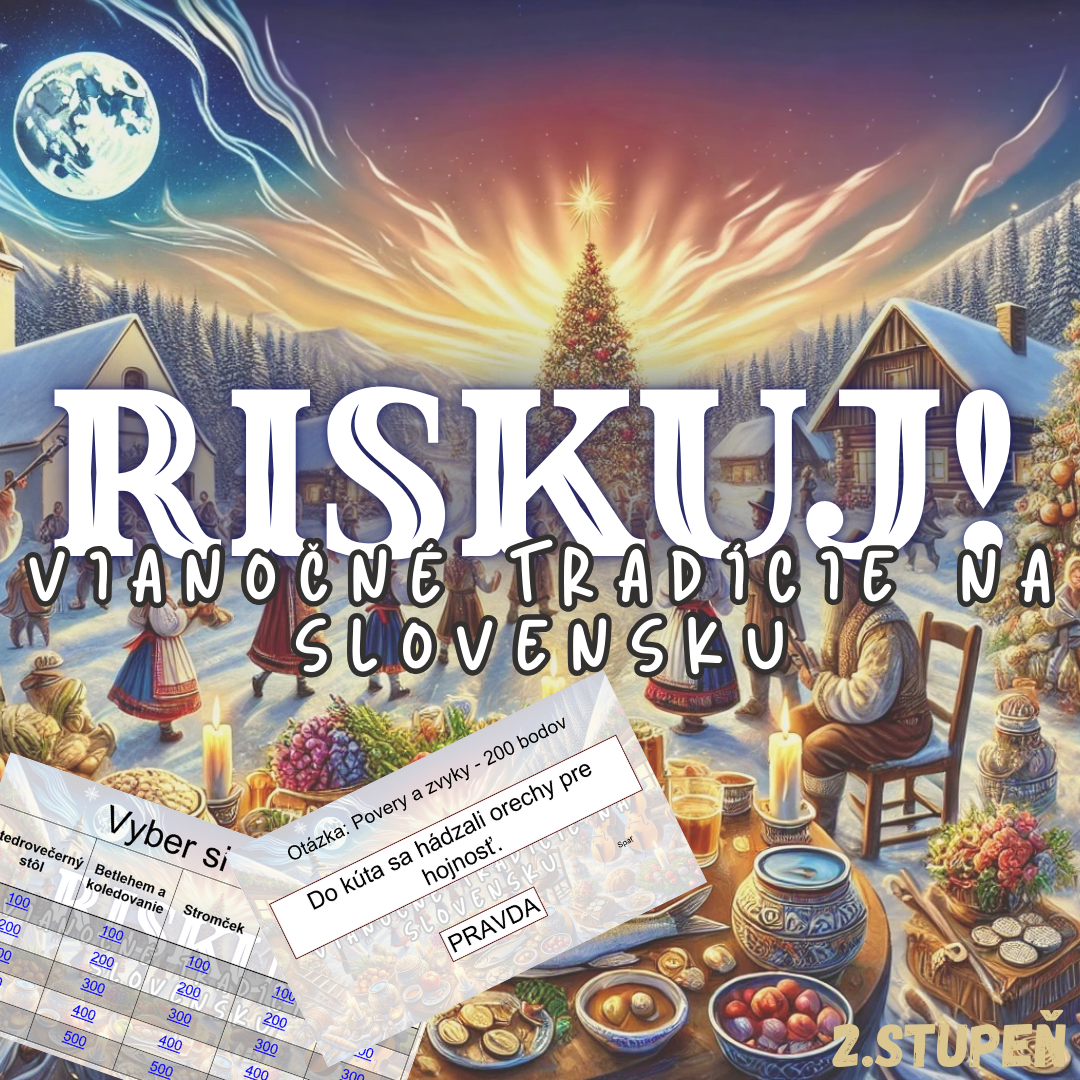 Materiál „RISKUJ! – Vianočné tradície na Slovensku“ je interaktívna a zábavná vzdelávacia hra, ktorá žiakom pomáha spoznať bohaté slovenské vianočné zvyky, symboly a tradície.