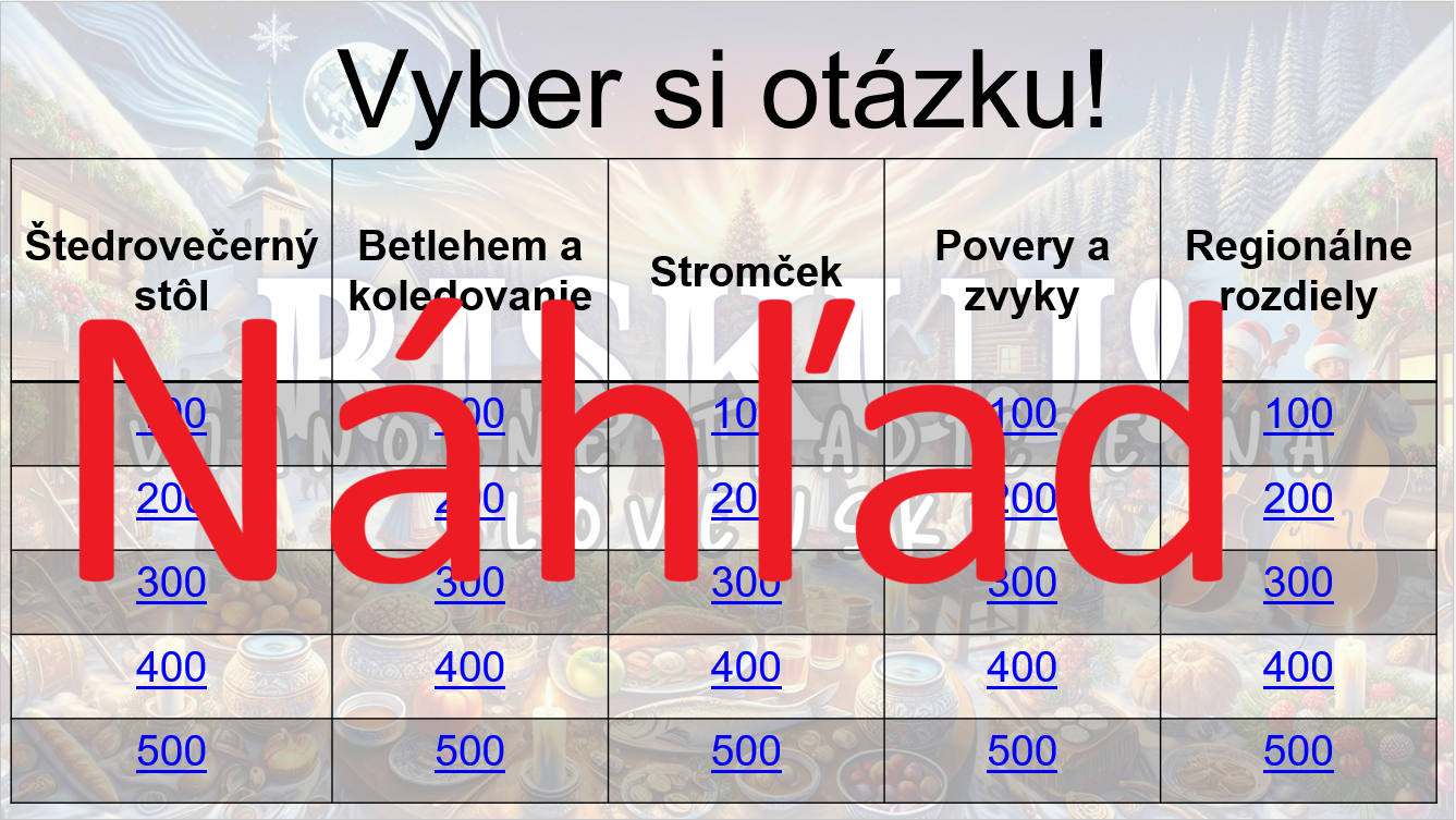 🔹 5 tematických okruhov s otázkami v hodnote 100–500 bodov,