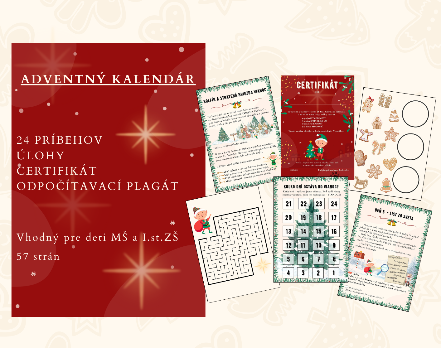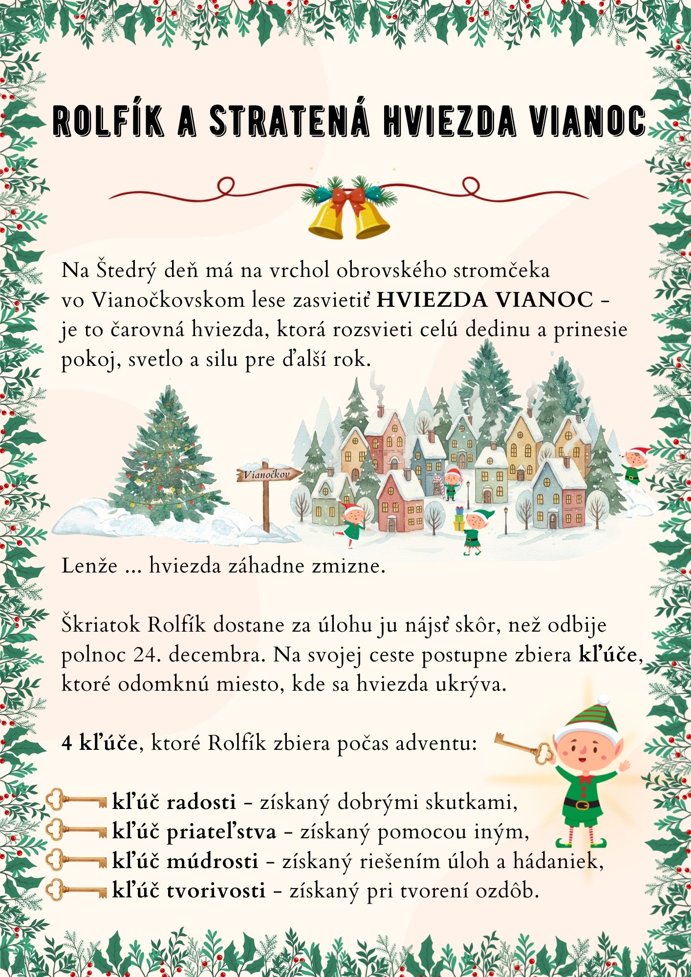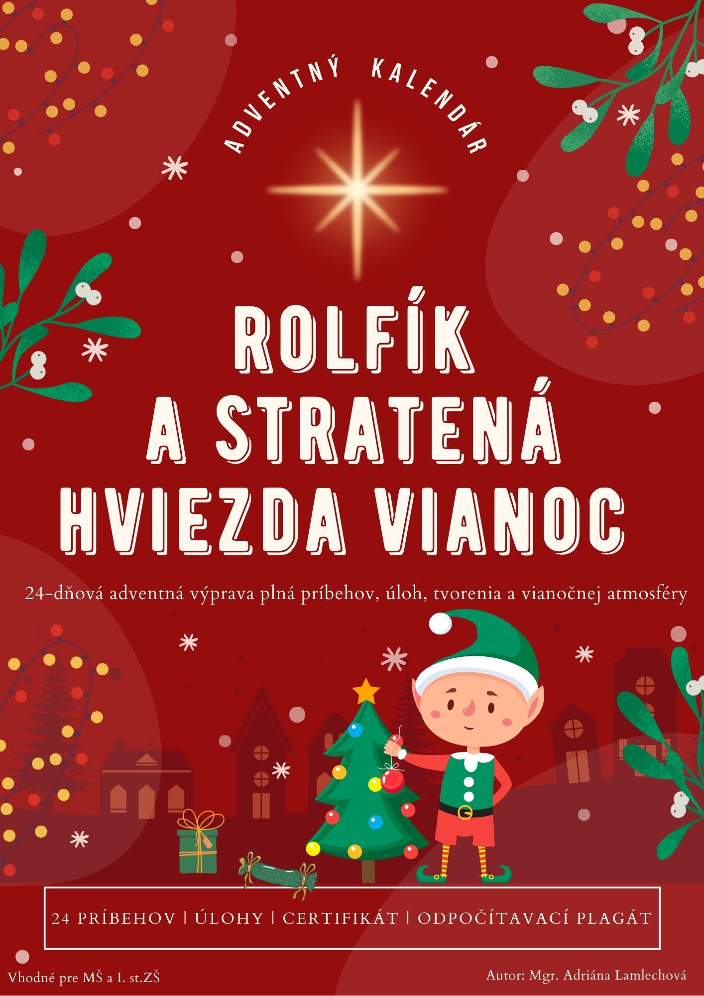 Vytvorila som 24-dňový rozprávkový adventný kalendár, v ktorom deti sprevádza škriatok Rolfík. Spolu s ním putujú čarovnou dedinkou, riešia hravé úlohy, robia dobré skutky a na svojej ceste musia získať 4 kľúče, aby našli stratenú HVIEZDU VIANOC.