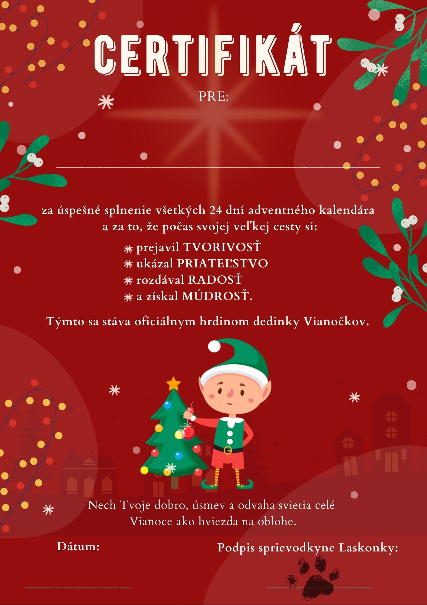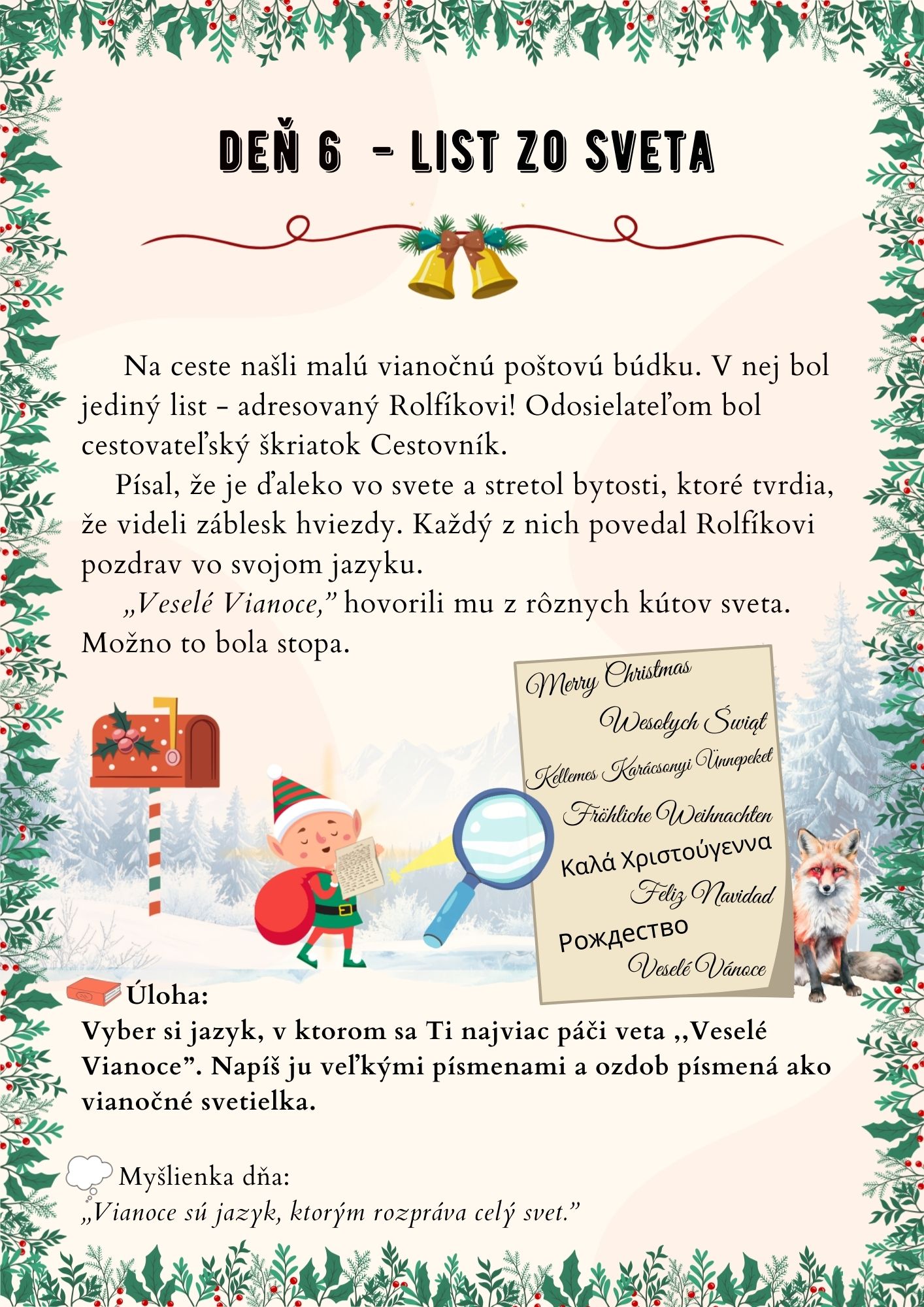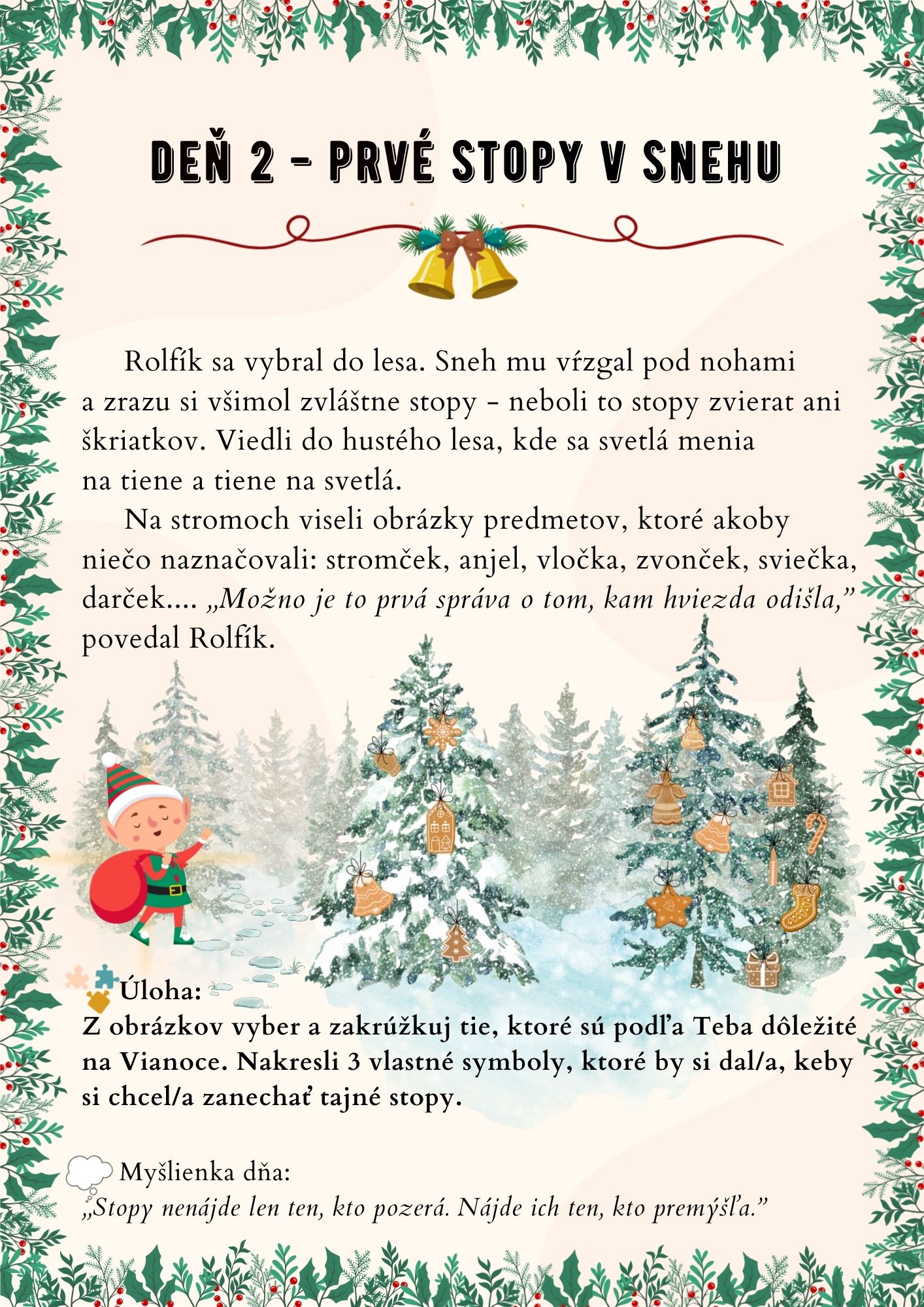Vytvorila som 24-dňový rozprávkový adventný kalendár, v ktorom deti sprevádza škriatok Rolfík. Spolu s ním putujú čarovnou dedinkou, riešia hravé úlohy, robia dobré skutky a na svojej ceste musia získať 4 kľúče, aby našli stratenú HVIEZDU VIANOC.
