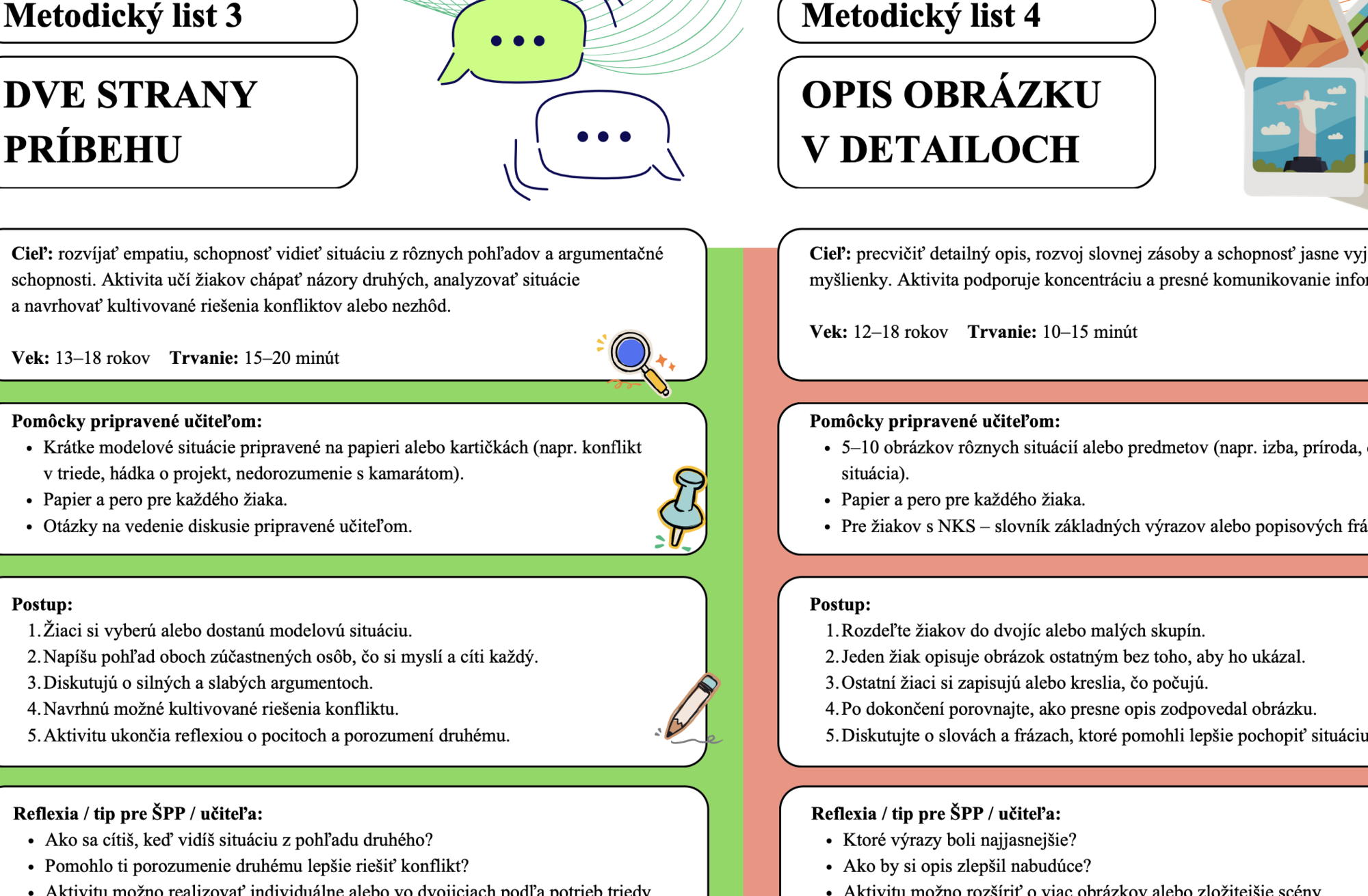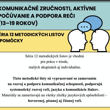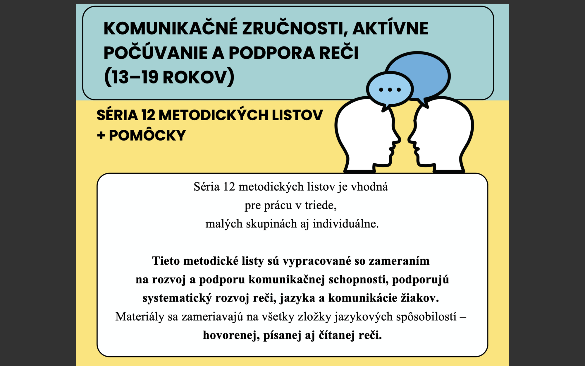 Tieto metodické listy sú vypracované so zameraním na rozvoj a podporu komunikačnej schopnosti, podporujú systematický rozvoj reči, jazyka a komunikácie žiakov.