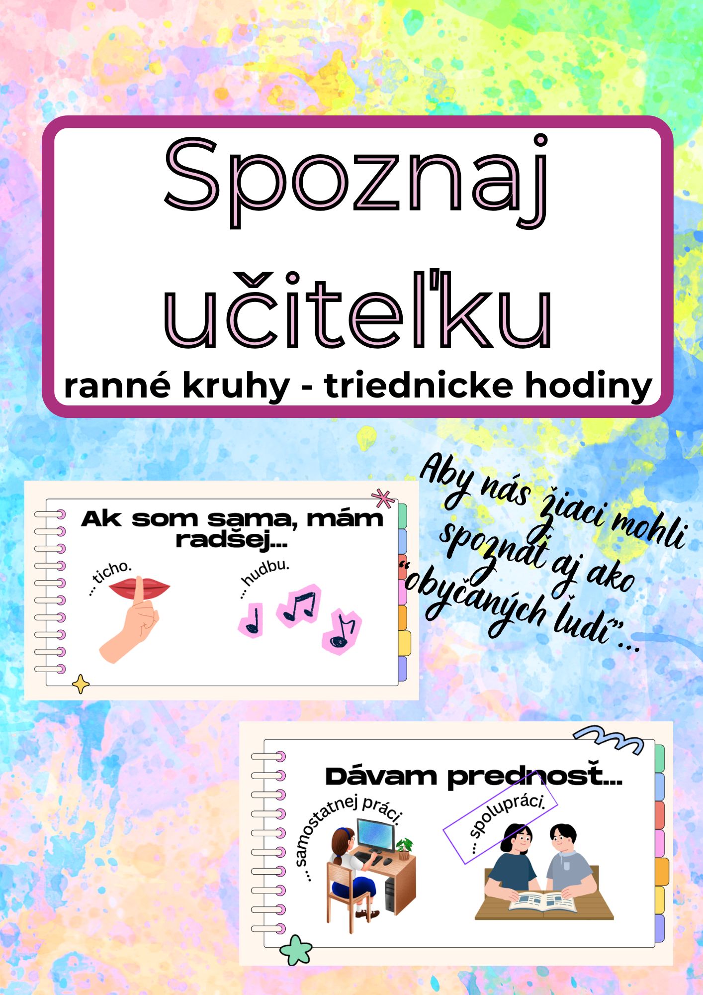 Materiál obsahuje 10 jednoduchých otázok vo formáte „Pani učiteľka radšej…“, pri ktorých majú žiaci vždy na výber z dvoch možností. Úlohou žiakov je hádať, ktorá možnosť je pre učiteľku typickejšia. Je to výborná forma na začatie neformálneho a uvoľneného rozhovoru medzi žiakmi a učiteľkou.