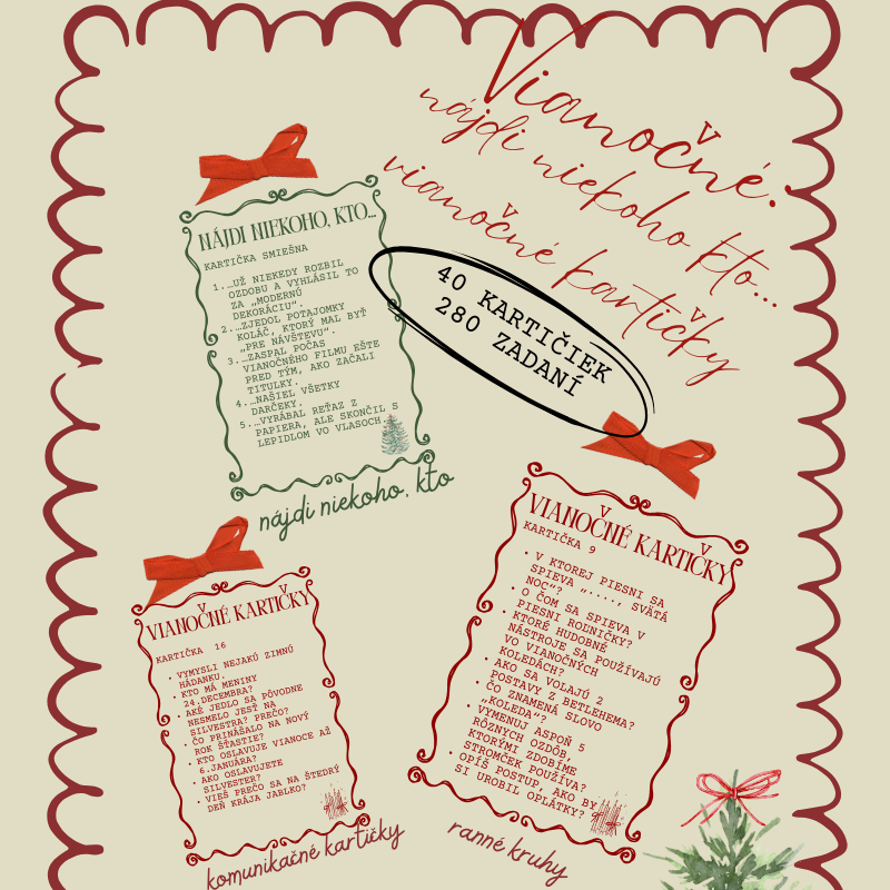 - Obsahuje komunikačné kartičky s otázkami o Vianociach a smiešne úlohy typu „Nájdi niekoho, kto…“, ktoré podporujú rozhovor, spoluprácu, pohyb a dobrú náladu.