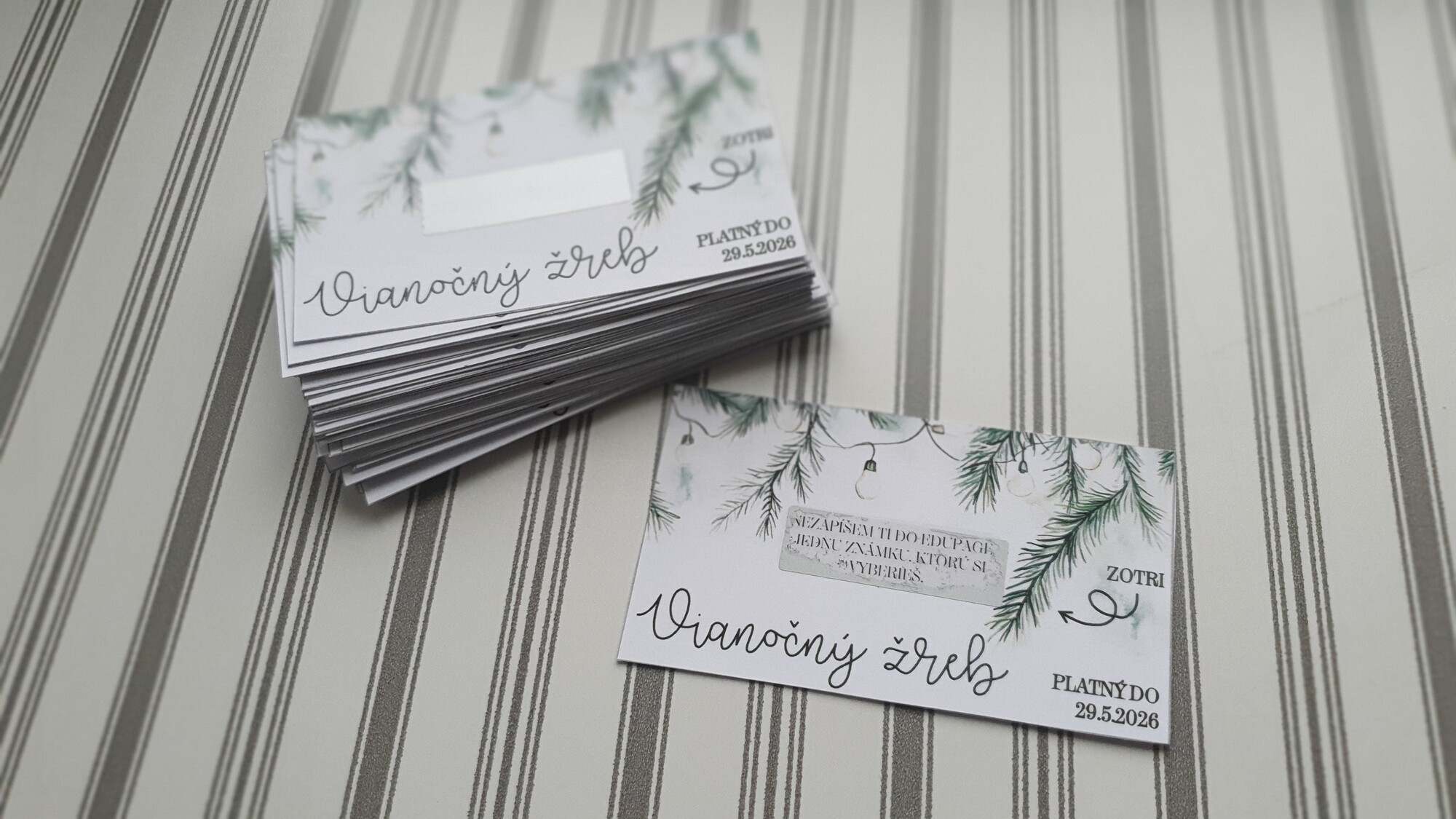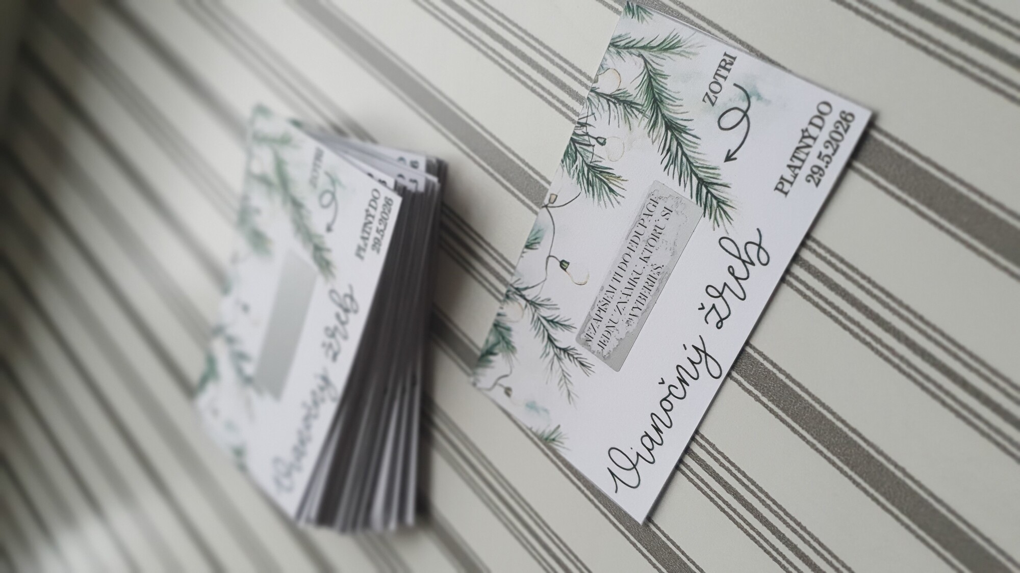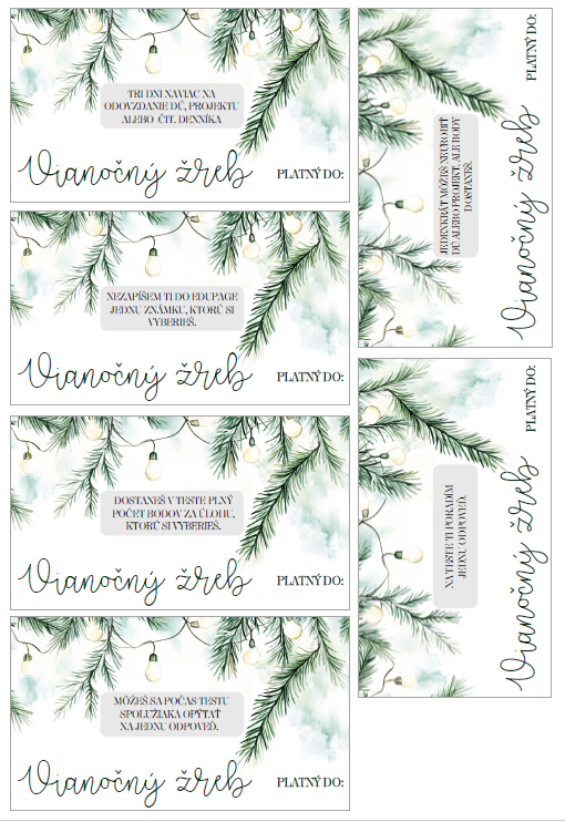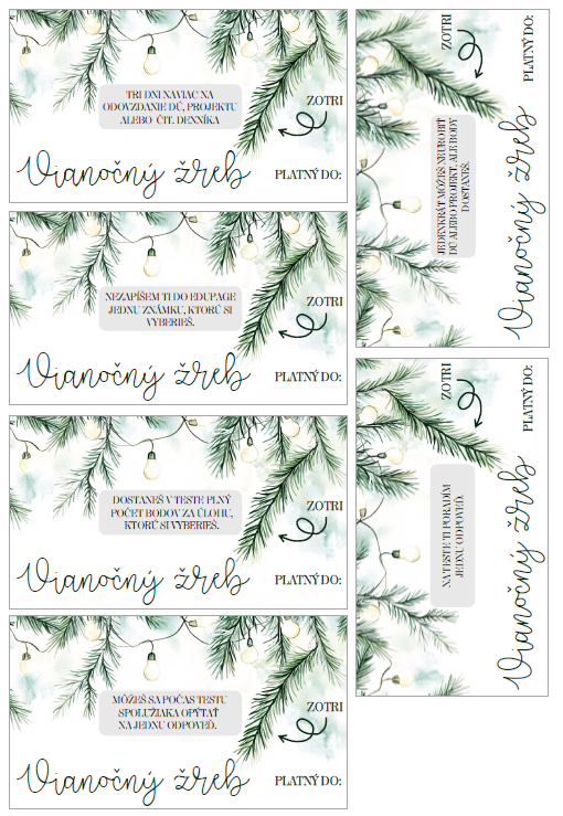 V PDF nájdete dvanásť vianočných žrebov s textom ZOTRITE a šípkou a dvanásť bez toho. Tie žreby, ktoré majú šípku a text ZOTRITE sú vyrobené na vytvorenie žrebov so stieracím políčkom. Tie bez neho len na vytlačenie a nie je potrebné s nimi viac robiť.