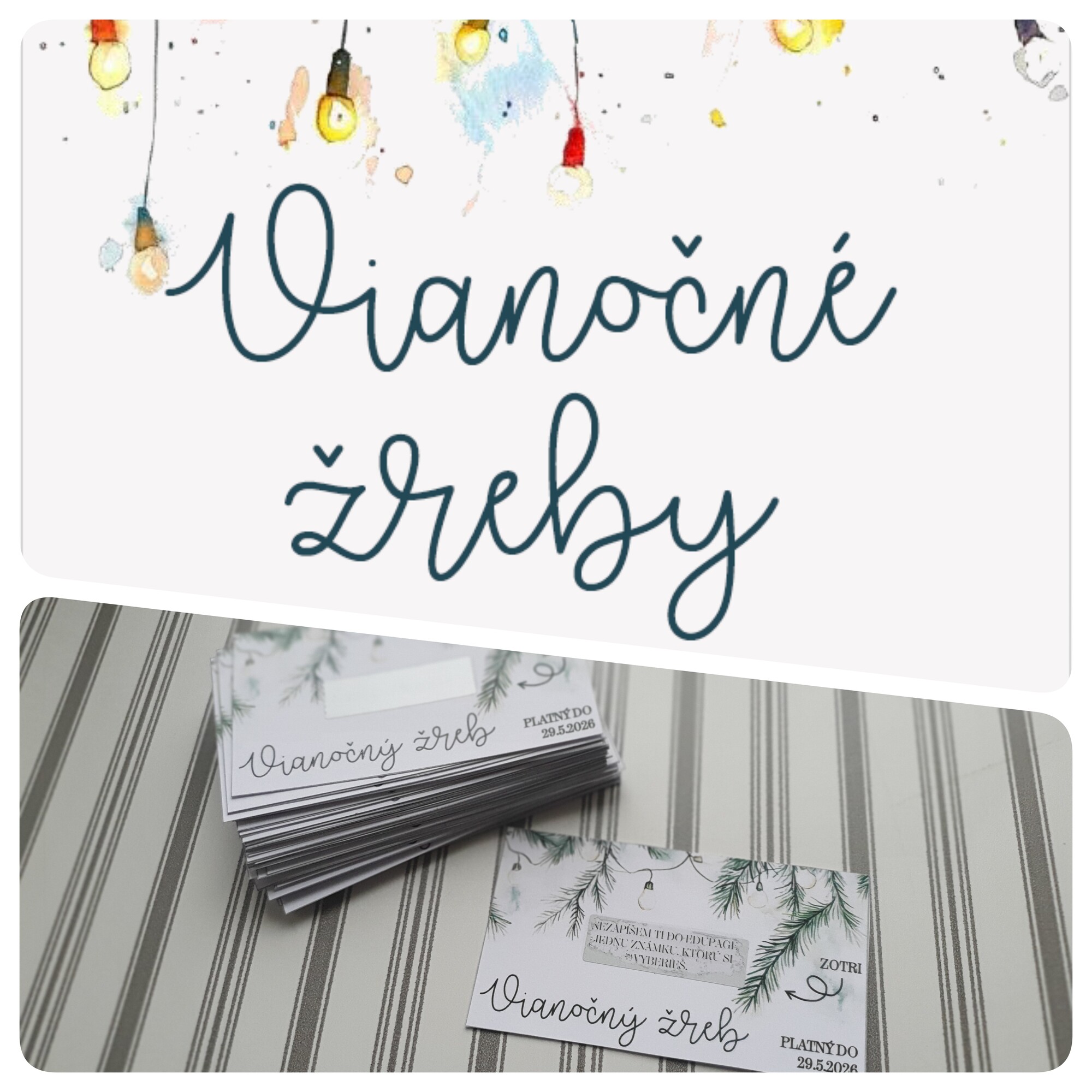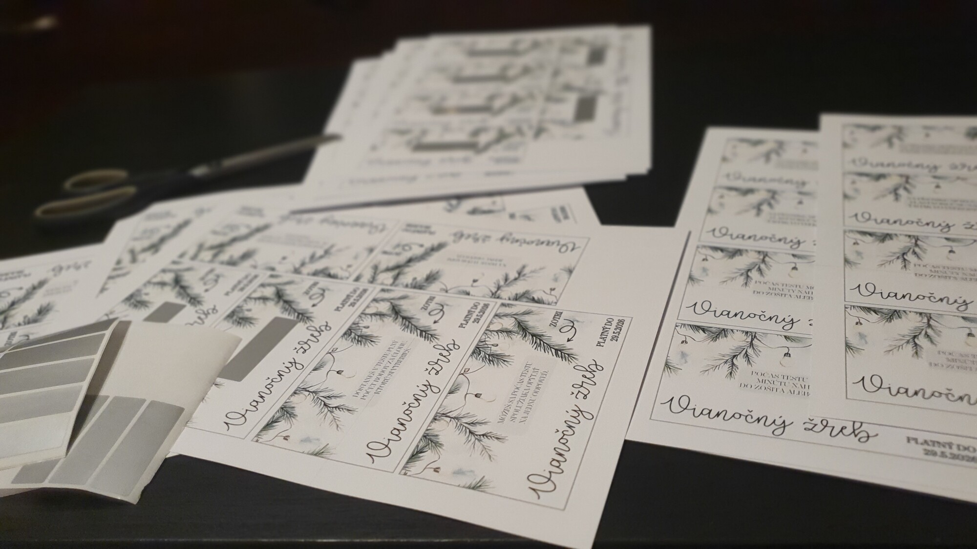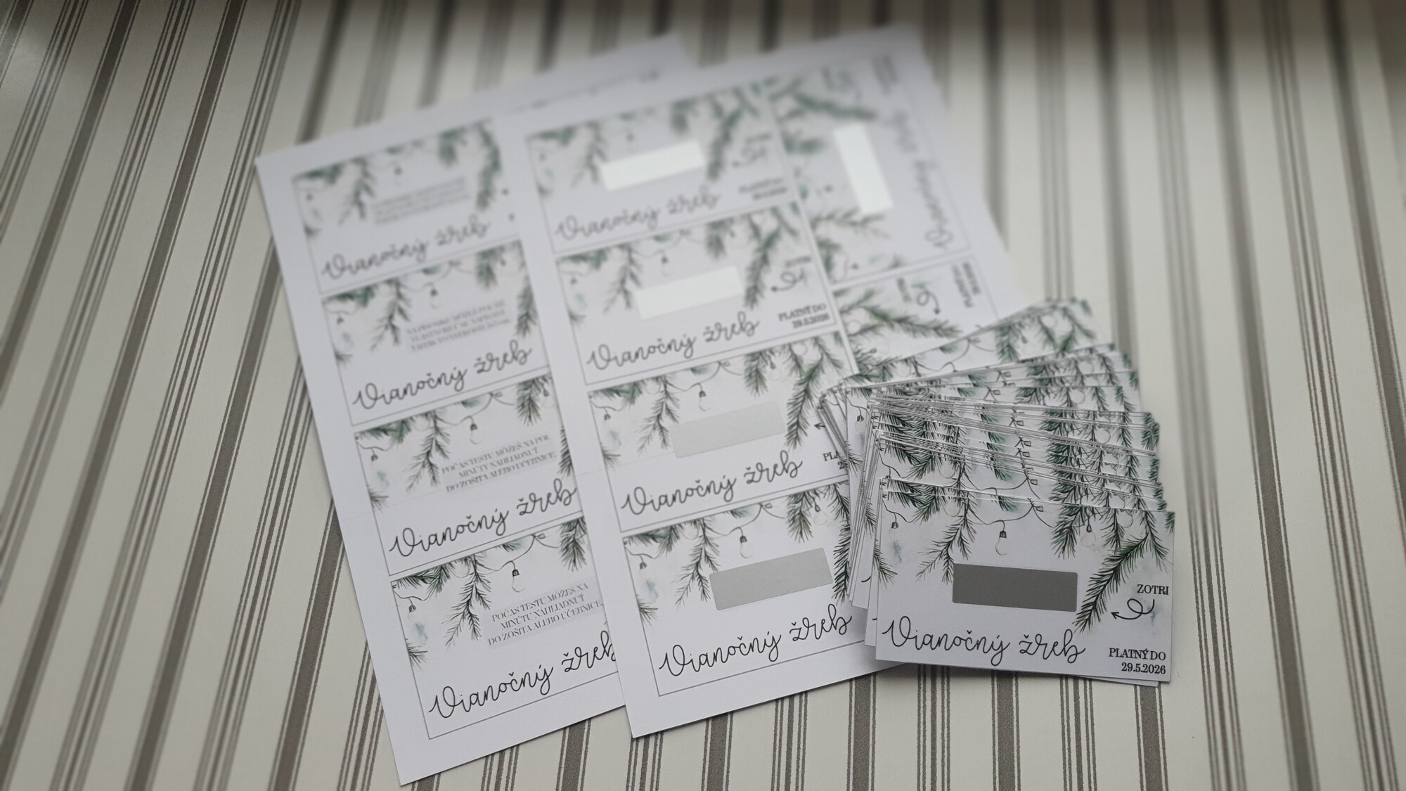 V PDF nájdete dvanásť vianočných žrebov s textom ZOTRITE a šípkou a dvanásť bez toho. Tie žreby, ktoré majú šípku a text ZOTRITE sú vyrobené na vytvorenie žrebov so stieracím políčkom. Tie bez neho len na vytlačenie a nie je potrebné s nimi viac robiť.