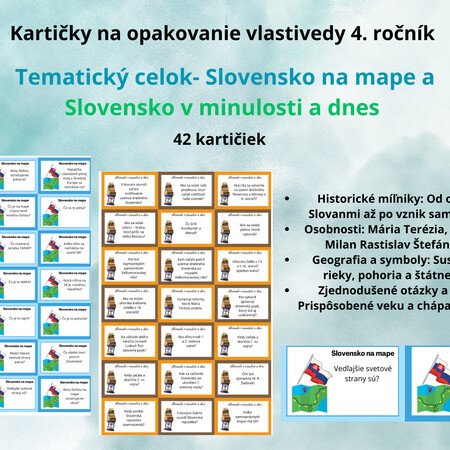 do rúk sa Vám dostáva súbor vzdelávacích kartičiek zameraných na témy z Vlastivedy pre 4. ročník. Tento materiál som vytvorila s cieľom pomôcť žiakom lepšie si osvojiť vedomosti o našej histórii, osobnostiach a geografii Slovenska hravou a prehľadnou formou.